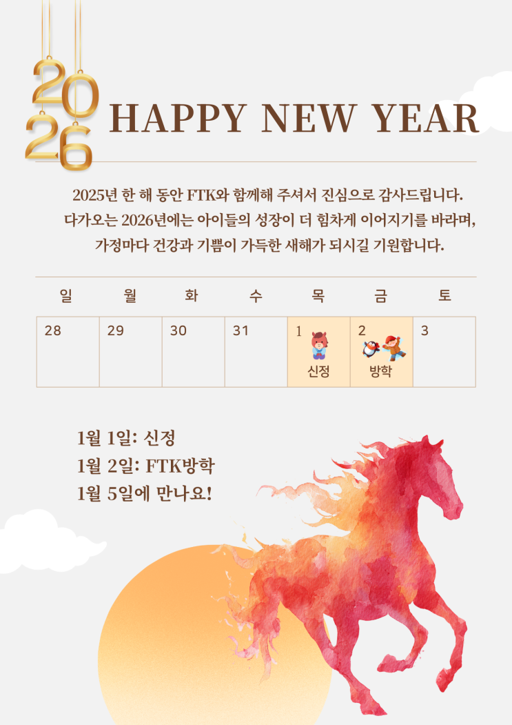 안녕하세요 진화된 미래형 영어교육, FTK어학원 입니다. 2025년이 저물어 가는 지금, 한 해 동안의 시간들을 돌아보게 됩니다. 각자의 자리에서 보낸 시간은 달랐지만, 그 모든 경험이 아이들과 우리를 한층 더 단단하게 만들었으리라 생각합니다. 다가오는 2026년은 ‘적토마의 해’, 붉은 말의 기운처럼 힘차게 나아가는 해라고 합니다. 새해에는 아이들이 자신의 속도와 방향을 믿고 더 자신 있게 도전하며 성장해 나가길 바랍니다. FTK는 아이들이 스스로 생각하고 표현하며 자신만의 힘을 키워갈 수 있도록 늘 옆에서 함께하겠습니다. 붉은 말의 기운처럼 아이들의 성장과 가정의 일상에 활력과 기쁨이 더해지는 2026년이 되기를 진심으로 바....... <img src="https://blogthumb.pstatic.net/MjAyNTEyMzBfMjQ4/MDAxNzY3MDg3MjI1NzU2.IuOShQqfIJEfvnHkWGXW1V43ZLd7XMa4pFabsWc0gE8g.1KWj__JvmtPquYiUOE6tN1Dl3qCc7hsHP7V_jNPWpQIg.PNG/2026%B3%E2_%BB%F5%C7%D8_%C0%CE%BB%E7.png?type=s3" />