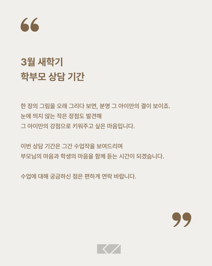안녕하세요 듀미술입니다. 새학기가 되며 그림을 사랑하던 친구들이 하나둘씩 전공을 하고 싶다고 말해오거나, 학부모님께서 연락이 오시곤 합니다. 이 친구에게 필요한 수업과 내가 더 알아야 할 부분은 없을까? 미술 수업을 통해 학생이 바라는 점과 학부모님이 바라시는 점은 어떤 것일까? 구체적으로 깊은 이야기를 듣고 싶었습니다. (제가 입시학원과 듀미술을 동시에 하고 있어, 학부모님들께서는 사소한 부분을 편안하게 말씀 주시기 어렵지 않을까 싶은 걱정도 있었습니다.) 학생을 짧게는 1시간 길게는 3,4시간씩 함께 하다보니 과연 우리 아이의 수업 태도와 실력은 어떤지. 자세히 말씀드리고 싶기도 했죠. 전화상으로 말씀드릴 수도....... <img src="https://blogthumb.pstatic.net/MjAyNjAzMTJfNzMg/MDAxNzczMjg0MjMyMDIx.b_XiU5nYUTDuFyCyUqIH5mfRCmDVCBX6BnekfyD9QBcg.E1DkpFaYAT_YeaD2KnclTfJw2IgQJeylPyb1Uy4241Mg.JPEG/%BB%F3%B4%E3.jpeg?type=s3" />