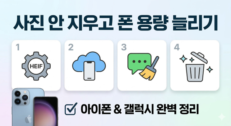 아이들 성장 사진, 여행지의 추억... 버릴 것 하나 없는 소중한 사진들인데 스마트폰은 자꾸만 "저장공간이 부족합니다"라는 메시지를 띄우며 우리를 괴롭힙니다. 용량 때문에 비싼 새 폰으로 바꿀 고민을 하고 계신가요? 사진을 한 장도 지우지 않고 저장공간을 획기적으로 확보하는 4단계 방법을 따라 해보세요. 1단계: 사진 포맷 최적화 (HEIF/HEIC) 화질은 유지하면서 파일 용량만 절반으로 줄여주는 최신 코덱을 설정하세요. 아이폰: [설정] > [카메라] > [포맷] > '고효율성' 체크 갤럭시: 카메라 앱 실행 > [설정] > [사진 형식] > '고효율 사진(HEIF)' 활성화 효과: 기존 JPG 대비....... <img src="https://blogthumb.pstatic.net/MjAyNjAzMTVfMTU1/MDAxNzczNTgwNDIzMjEw.BBkaEtkJv8RSAIggdKGmhzyDVluY0xZBa-3kqR9HKnAg.sUIXzIdDknqqv9ETwIUtwIfIuaynMyiue_eemFoEuFUg.PNG/7.png?type=s3" />