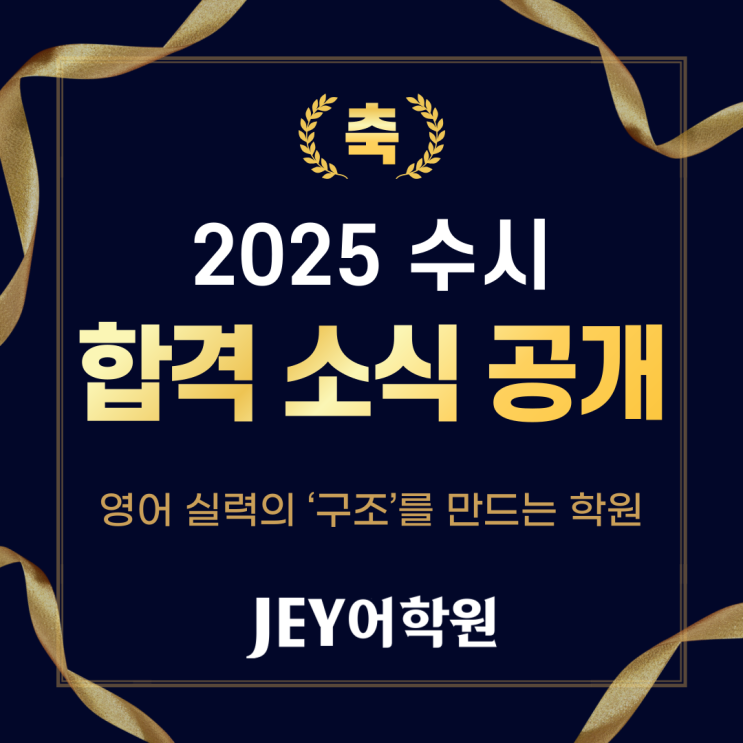 2025 수시 결과 공개|JEY어학원, 결과는 과정에서 나옵니다 2025학년도 수시 전형 결과가 하나둘씩 발표되고 있습니다. JEY어학원에도 반가운 소식들이 계속해서 전해지고 있고, 앞으로도 JEY어학원 학생들의 수시 합격 소식은 순차적으로 업로드될 예정입니다. 입시를 지켜보면 늘 같은 생각이 듭니다. 결과는 갑자기 만들어지지 않는다는 것. 특히 영어는 더더욱 그렇습니다. 단기간에 요령만 익혀서 점수를 올리기보다는, 시간이 지날수록 실력이 쌓이고, 고3이 되어도 흔들리지 않는 영어를 만드는 것이 중요합니다. JEY어학원은 바로 그 지점을 가장 중요하게 생각하며 수업을 이어오고 있습니다. 동탄고·능동고 영어, ‘데이터’로 준비합....... <img src="https://blogthumb.pstatic.net/MjAyNTEyMjNfNTYg/MDAxNzY2NDkxNTc1MjM5.oJjH_WZfuTryDZpPUyBlX854SN_vdb0B5P-BHzR4g2wg.FNOaulA5FyuD0JHd996Q4RoBDhqxdtAT_WNmxr8EGGcg.PNG/%BA%ED%B7%CE%B1%D7-%BD%E6%B3%D7%C0%CF-005.png?type=s3" />