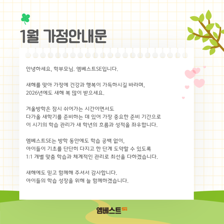 학부모님, 안녕하세요! 학습의 올바른 길을 제시하는 미래엔영어수학입니다. 새 학년의 출발선에 서는 1월, 지금의 학습 관리가 올해의 결과를 만듭니다. 미래엔영어수학은 현재 학습 수준을 기반으로 개념 이해도와 문제 해결 과정을 점검하고, 맞춤 문제 제공과 학습 결과 분석을 통해 아이 스스로 학습 과정을 이해하고 계획적으로 공부하는 힘을 기를 수 있도록 지도하고 있습니다. 새 학년, 흔들리지 않는 수학. 미래엔수학이 책임지고 관리하겠습니다. 감사합니다. ■ 1월 첫 수업 : 1/5(월) ■ 동시통역데이 : 1/28 (수) ■ 수학 월말평가 : 1/29(목) ■ 휴강일 1 / 1 (목) 신정 ■예비 중등반 영어 수학 1월 개강 ■2월 첫 수업 : 2 / 2 ....... <img src="https://blogthumb.pstatic.net/MjAyNjAxMDRfMTM3/MDAxNzY3NTA4NTM5MTgy.BX0UV42qFRN0avaIBRjqAu9VX2YC7UWB3e5JTFx5CR4g.K4OOgrmLKQIqtFcQR6XJEGN4g4yieHdCQF4Znf41nlUg.PNG/%BB%E7%C0%CE%B9%B0_%C0%FC%B8%E9_%C6%C4%B4%CF%C7%C3%B7%BA%BD%BA_%BB%E7%C0%CE_%BF%B5%BE%EE%BC%F6%C7%D0.png?type=s3" />