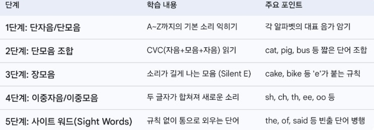 영어 공부를 처음 시작할 때 "파닉스부터 해야 하나요?"라는 질문을 정말 많이 받습니다. 오늘은 아이들이 영어 읽기에 자신감을 갖게 되는 핵심 원리인 파닉스의 뜻부터 효과적인 학습법까지 핵심만 쏙쏙 정리해 드리겠습니다. 1. 파닉스란?? 파닉스는 글자(Grapheme)와 소리(Phoneme) 사이의 규칙을 배우는 학습법입니다. 단순히 알파벳 이름을 외우는 것이 아니라, 각 알파벳이 단어 속에서 어떤 소리를 내는지 익히는 과정입니다. 예시: 알파벳 'A'의 이름은 '에이'지만 단어 "Apple"에서는 '애' 소리가 난다는 규칙을 배우는 것입니다. 2. 파닉스가 왜 중요한가요? 읽기 자신감: 처음 보....... <img src="https://blogthumb.pstatic.net/MjAyNjAyMjVfMTY5/MDAxNzcyMDAyMjg4NDU3.7nTyEhiyehOAheL1jqzJvDu5prkYcPYFm7Eby3-edpEg.JacqZZSfWobVX31fCb44W31YXMy0ijgv9vIgeTiFN_4g.JPEG/900%A3%DFScreenshot%A3%DF20260225%A3%DF152328%A3%DFGoogle.jpg?type=s3" />