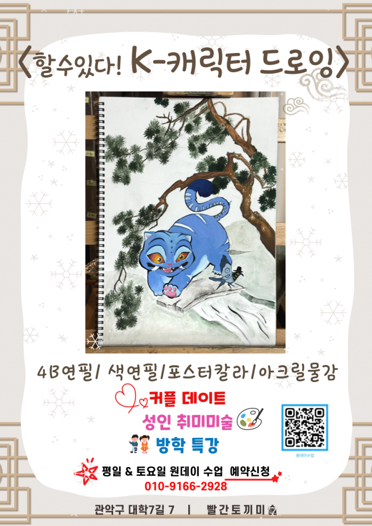 신림동미술/겨울방학미술특강/더피그리기 외 안녕하세요^^ 빨간토끼미술에서 2026 겨울방학맞이 미술특강& 이벤트수업 & 원데이(체험)수업을 준비했습니다. !! 모든 수업은 일주일 전 사전 예약 필수 !! 데몬 헌트릭스 모든 캐릭터 및 OST까지 모두 사랑받았던, 더피와서씨.. 너무 귀엽고 사랑스럽죠~ 직접 그려보고 싶지않으세요? 미술 원데이 수업에서 구도부터 채색까지 차근차근 배워 완성도 높은 나만의 작품으로 만들어보세요~! 미술 처음 접하는 분들도 즐겁게 참여하실 수있어요^^ 더 많은 특강 프로그램 과 자세한 내용은 아래 링크!!^^ ️ 수업 일정 & 예약 안내 • 수업 요일: 평일 & 토요일 오전 11시부터....... <img src="https://blogthumb.pstatic.net/MjAyNjAxMDVfMjAw/MDAxNzY3NjE0ODU5NTYx.b2MEGZHrFYOg6lAo2rzlkK3Dj1G9iLxVCtSvTd4czz4g.XNWZi3cK6EF4MgvF18yYL31VL250jNzYmb_7Y8m6-Asg.PNG/%BF%F8%B5%A5%C0%CC-001.png?type=s3" />