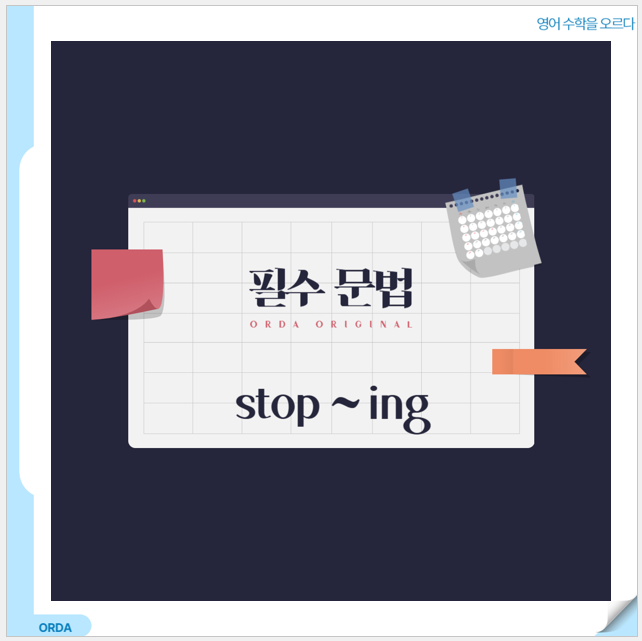 안녕하세요 오르다입니다. 이번 시간에는 필수 문법 stop ing에 대해 알아보겠습니다. 기본 의미 = “~하는 것을 멈추다” / “~을 그만두다” / “~을 중단하다” 핵심은 멈추는 대상이 ‘행동(동작)’이라는 점입니다. 즉, stop 뒤의 -ing는 stop의 목적어(대상) 역할을 합니다. 예) He stopped smoking. → 그는 담배 피우는 것을 끊었다/그만뒀다. 문장 구조 주어 + stop (stopped) + V-ing (+ 목적어/부사구) 구성 요소 설명: stop: 중단하다 V-ing(동명사): 중단하는 “행동” (stop의 목적어) 주의 사항 1. stop -ing에서 -ing는 동명사(명사 역할)이다 stop 뒤의 -ing는 행동을 하나의 ‘것’으로 보는 구조 따라서 stop의 목적어 자....... <img src="https://blogthumb.pstatic.net/MjAyNjAxMDdfMjE3/MDAxNzY3Nzg4ODE3MzQy.TOuXJ4QQaLkmPU-oPWf4sHQPzQxk5ceREJCAJ0CbOgIg.5cNorFO86JoBblhtYKyn1CIkGTV23bmPA-YjWv0WjF0g.PNG/%C7%A5%C1%F6.png?type=s3" />