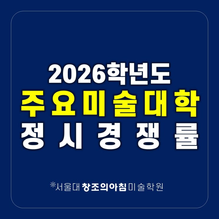 안녕하세요? 관악구미술학원 서울대창조의아침입니다. 지난주에 2026학년도 정시 전형 지원이 마무리되었는데요. 2026학년도 미술대학 정시는 겉으로 보면 “작년과 비슷해 보이지만”, 경쟁률 이미지를 하나하나 뜯어보면 분명한 방향성이 드러나는 해였습니다. 이번 포스팅에서는 주요 미술대학들의 2026학년도 정시 경쟁률을 살펴보고 분석해 보는 시간을 가지려고 합니다. 2026 정시 경쟁률, 이미지 기준 전체 흐름 2026 정시는 다음 세 가지로 요약됩니다. ✔ 상위권 대학: 경쟁률 유지 또는 소폭 상승 ✔ 중상위·중위권 대학: 경쟁률 하락 대학 다수 ✔ 실기전형임에도 전형 구조·모집 인원 변화가 결과에 큰 영향 즉, ‘모두 어려운 정시....... <img src="https://blogthumb.pstatic.net/MjAyNjAxMDJfODIg/MDAxNzY3MzUwNDMyNjcw.yOBDHGhrI2KHDk9udSlAvGoZIWGO4sN3Z7Nusr0nkSAg.kslNs49UEtK3o47hEVUUu5Ol0e9v9RQ5U9uWxGPLytYg.JPEG/%B0%FC%BE%C7%B1%B8%B9%CC%BC%FA%C7%D0%BF%F8_2026_%C1%A4%BD%C3_%B0%E6%C0%EF%B7%FC_%BC%D2%B0%B30.JPG?type=s3" />