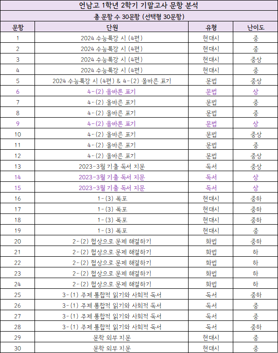 2025 언남고등학교 1학년 2학기 기말고사 국어시험 분석
