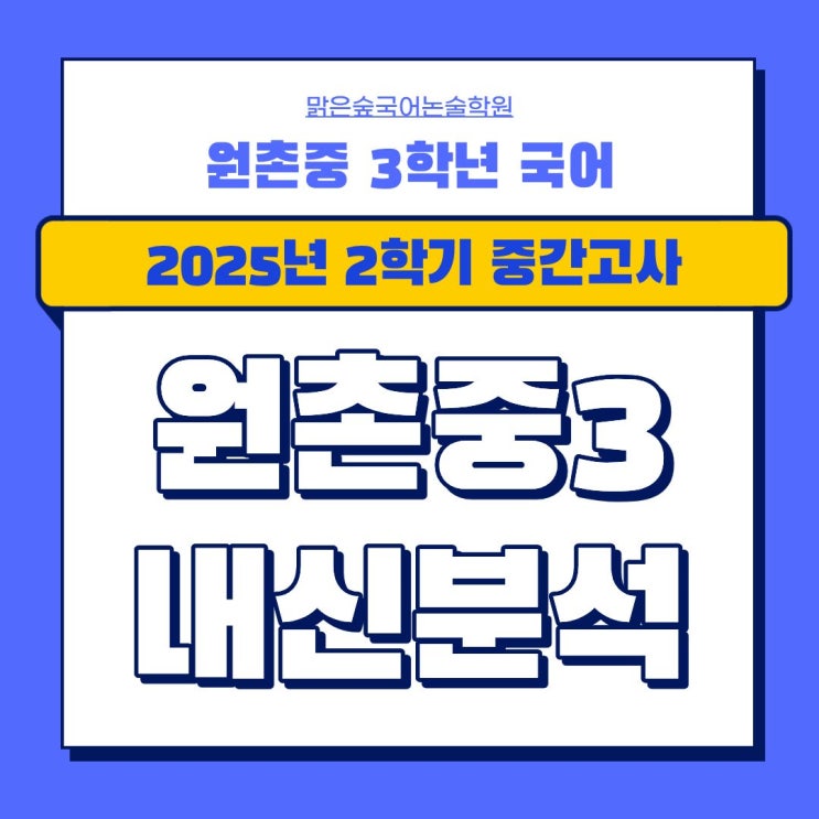 안녕하세요, 맑은숲국어논술전문학원 숲지기입니다. 오늘은 원촌중 3학년 2025학년도 2학기 중간고사 국어 내신 분석을 정리해 드립니다. 시험 구성과 난이도, 그리고 실제 변별력이 있었던 문제들을 중심으로 살펴보겠습니다. 【 시험 정보 】 이번 시험은 원촌중 3학년 2학기 중간고사 국어 시험으로, 출제 단원은 1단원, 2단원, 3단원이었으며 출제일은 10월 28일입니다. 교과서 전 범위를 고르게 다루면서도 단원 간 개념을 연결해 묻는 문항들이 포함된 시험이었습니다. 【 시험 총평 】 예년에 비해 문법 영역은 더 어렵고 까다롭게 출제된 반면, 나머지 영역은 비교적 평이하게 출제되어 난이도가 명확히 갈린 시험이었습니다. 특히 소설....... <img src="https://blogthumb.pstatic.net/MjAyNjAxMTRfMjIx/MDAxNzY4Mzc3NjUxMzQ0.HUfmVqCkSHkHu-lsj6Bx15D37fyVT3XpafUPoBmS0GEg.4z4RHPwljPttsx1Rdk6xeV9gkYhdXHN0Q9xl9iOY9ecg.JPEG/29.jpg?type=s3" />