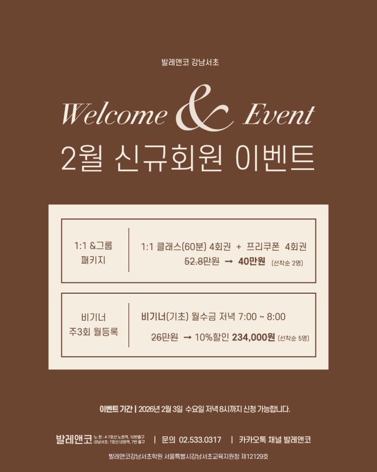 · 이벤트 기간 | ~ 2026년 2월 3일(수)까지 · 이벤트 지점 | 발레앤코 강남서초 · 이벤트 안내 | 1:1&그룹 패키지 / 비기너 주3회 월등록 2월 10% 할인 · 이벤트 대상 | 발레앤코가 처음인 신규회원 대상 발레앤코 강남서초 2월 신규회원 이벤트 ①1:1&그룹 패키지 할인 ② 비기너 주3회 월등록 할인 첫번째, 1:1 & 그룹 패키지 할인 (선착순 2명) 한 사람을 위한 취미발레 클래스 + 함께 즐기는 취미발레 클래스 1:1클래스로 세심한 교정과 즐거운 그룹수업을 함께 경험할 수 있는 구성이에요. 1:1 & 그룹 패키지 할인 1:1 클래스 60분 4회권 + 그룹클래스 프리쿠폰 4회 정가 528,000원 → 이벤트가 400,000원 (선착순 2명....... <img src="https://blogthumb.pstatic.net/MjAyNjAxMTZfMzIg/MDAxNzY4NTU2OTM4MTQ5.oiXR0d_7QFPfz_5HVsXz88bESBgt_aFk22lyj0oMT9wg._d5XoCNxr7A0qN321JSsUucVn-jhrq7wtRlLypDI8HQg.JPEG/2%BF%F9%C0%CC%BA%A5%C6%AE-1.jpg?type=s3" />
