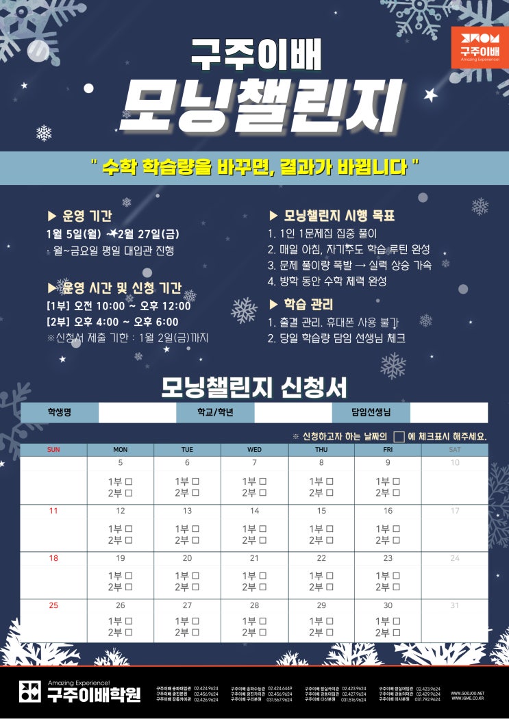 안녕하세요 구주이배 잠실본원입니다. 1/5(월) ~ 1/30(금)까지 1월 미라클 모닝이 마무리 되었습니다. 미라클 모닝 (초,중등) 방학 중 오전시간 자기주도학습 프로그램 ➀ 등원 직후 우선도에 따라 일일학습 플래너를 작성 ➁ 학습종료 후 성취율을 기재하여 제출 후 귀가 주어진 시간 내 학습 계획을 세우는 것이 낯설거나 어려울 수 있는 학생들에게는 학습 플래너 작성이 큰 도움이 될 수 있습니다. 모닝 챌린지 (고등) ➀ 1인 1 문제집 집중풀이 ➁ 매일 아침, 자기주도 학습 루틴 완성 ➂ 폭발적인 문제 풀이량으로 실력 상승 가속 ➃ 방학 동안 수학 체력 완성! 1월 미라클모닝 시행 사진 미라클모닝 1월 일....... <img src="https://blogthumb.pstatic.net/MjAyNjAxMzBfMTc1/MDAxNzY5NzU5OTU3MjY5.KeLHP-_ypXE_LL-MCKYi9WikSMiMSVLwO7BAzOzpTkgg.BBNhR5Ec4aMzCzBW5rKYdK6kGj2yGYUGedaJ-qpn7Mgg.JPEG/2026_%B0%DC%BF%EF_%B8%F0%B4%D7%C3%A7%B8%B0%C1%F61_%BD%C5%C3%BB%BC%AD.jpg?type=s3" />