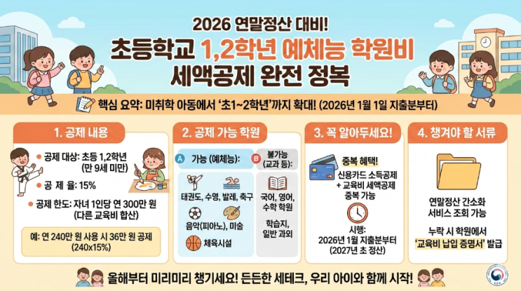 안녕하세요, 포르테앤피아노입니다! 우리 아이들이 초등학교에 입학하면서 교육비 부담이 늘어나 걱정하셨던 학부모님들께 아주 반가운 소식을 들고 왔습니다. 정부의 세법 개정으로 인해 2026년 1월 지출분부터 초등학교 1, 2학년 자녀의 예체능 학원비도 세액공제가 가능해집니다! 무엇이 달라지나요? 기존에는 '미취학 아동'까지만 학원비 세액공제가 가능해, 초등학교에 입학하면 혜택이 바로 끊겨 아쉬움이 크셨죠? 이제는 그 범위가 초등학교 2학년까지 확대되었습니다. 대상: 초등학교 1~2학년 자녀를 둔 학부모님 공제율: 결제 금액의 15% (세금에서 바로 차감!) 공제 한도: 자녀 1인당 연간 300만 원 계산해 볼....... <img src="https://blogthumb.pstatic.net/MjAyNjAzMDZfMjcz/MDAxNzcyNzYzNzM0NDgw.s7A1q6CgHOh9L3uStiN_RodeJLijTta_wnldamzgMl0g.Q3QX8VcOWQM4uwKsSN01H8bOcWiTkXmTCDyNUCZCZiQg.PNG/900%A3%DF1772758577487.png?type=s3" />