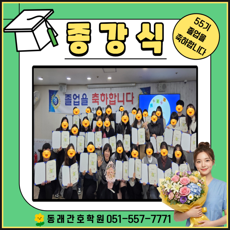 안녕하세요~ 동래간호학원입니다. 오늘은 기다리고 기다리던, 하지만 한편으론 아쉬운 마음이 가득한 55기 학생분들의 종강식 소식을 들고 왔어요~ 긴 시간 동안 이론과 실습을 병행하며 쉼 없이 달려온 우리 학생들! 고생 많으셨습니다. 종강식을 맞이하여 원장님을 위해 꽃바구니를 준비해 준 55기 여러분들께 감사함을 전합니다 설레는 새 출발을 앞둔 학생들의 감동의 순간들을 기록해 볼게요~ 벌써 1 넌 전이라니, 기억나시나요? 첫 만남인 입학식 날인데요. 입학식 날에는 학원생활과 앞으로의 일정에 대해 원장님께서 꼼꼼하게 알려주셨어요. 각자의 꿈을 안고 한자리에 모인 학생들의 눈빛이 얼마나 반짝반짝하던지요✨ 26년....... <img src="https://blogthumb.pstatic.net/MjAyNjAzMDNfNTcg/MDAxNzcyNTM2NTIyMzg1.XAUKIE3-9Lt_JVNO87wblZJGqfPIjbX85x9l8m30bJYg.wcwr0v40EZCUsUWh-CxLxftD7RBkU_pB44LC6XeZseUg.PNG/%C1%A6%B8%F1%C0%BB_%C0%D4%B7%C2%C7%D8%C1%D6%BC%BC%BF%E4._%288%29.png?type=s3" />