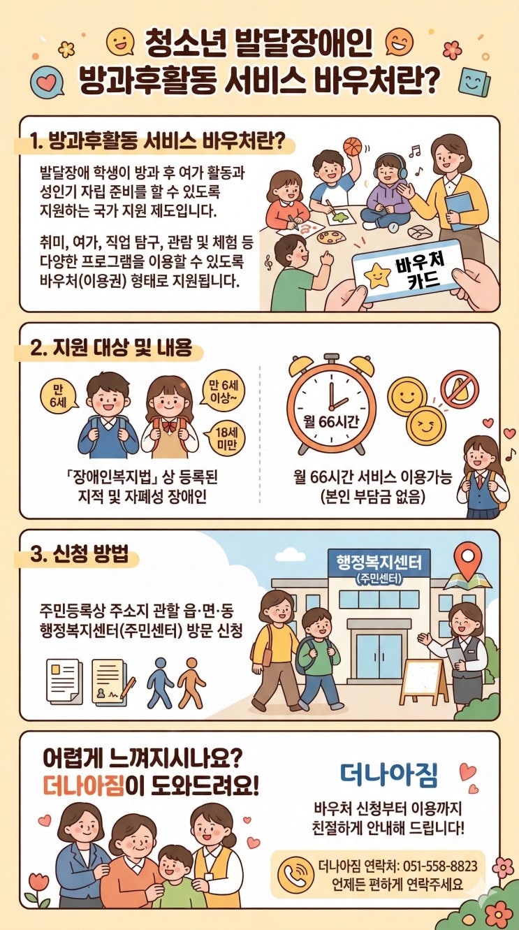 안녕하세요! 교육 불평등 해소와 돌봄 공백 최소화를 위해 앞장서는 고용노동부 인증 사회적기업, 주식회사 더나아짐입니다. 발달장애를 가진 우리 아이가 학교 수업을 마친 후, 남는 시간을 어떻게 보내야 할지, 성인기 자립 준비는 어떻게 시작해야 할지 고민이 많으실 텐데요. 오늘은 부모님들의 이러한 고민과 경제적 부담을 덜어줄 수 있는 아주 유용한 국가 지원 제도인 [청소년 발달장애인 방과후활동 서비스 바우처]에 대해 자세히 안내해 드리겠습니다. 1. 청소년 발달장애인 방과후활동 서비스 바우처란? 발달장애 학생이 방과 후 여가 활동을 즐기고, 다가올 성인기 자립을 준비할 수 있도록 돕는 국가 지원 제도입니다. 취미, 여....... <img src="https://blogthumb.pstatic.net/MjAyNjAzMDdfMjU4/MDAxNzcyODUxNDAxMTk1.rEVD2Xer_Gl1JG0bLSohbHZ7Rxop_ccjLLu4aBcRbOAg.aUZA4S1MLzvNUS5ipR6AydNgP6PWfTmph58l1v2mnwAg.JPEG/%BA%ED%B7%CE%B1%D7_%C0%FC%B4%DC%C1%F61.jpg?type=s3" />