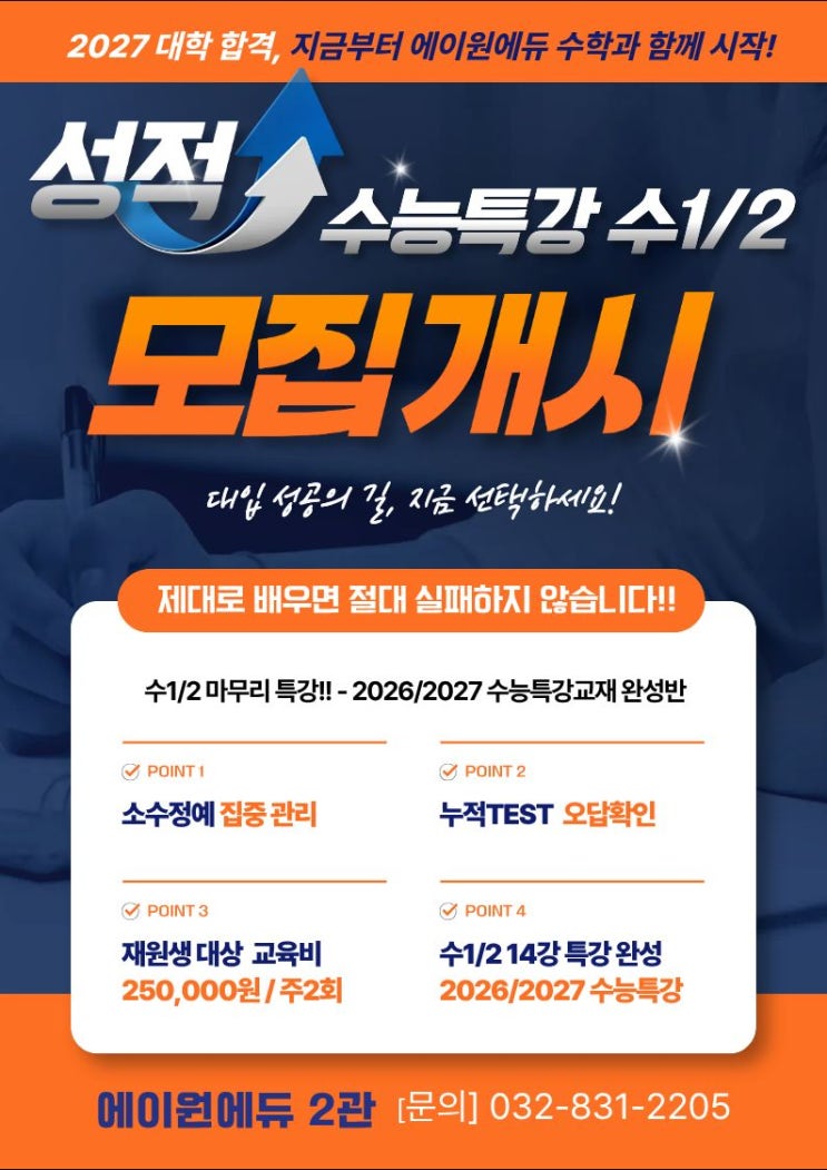 [동춘동 수학학원] 1% 상위권으로 도약하는 겨울방학대비,예비중1부터 미적분 특강까지~!