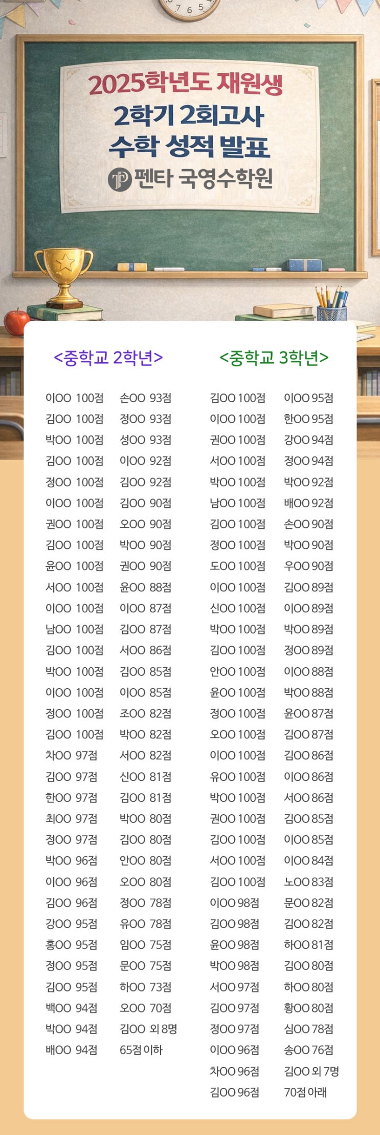 안녕하세요~ 펜타 국영수 학원입니다. 2025학년의 마지막 2학기 2회고사를 잘 마무리짓고 이제 2026년도의 새해가 밝았습니다. 이번 기말고사는 단순한 한 번의 시험이 아니라 지난 한 해를 정리하고 마무리하는 중요한 과정이었습니다. 현재 펜타 국영수 학원의 중학교 2,3학년 재원생들의 점수를 모았습니다. 누구보다 열심히 준비했고, 시험을 앞두고의 긴장감과 부담도 각자 나름의 방식으로 잘 이겨낸 모든 펜타 학생들, 정말 수고 많았습니다. 결과가 기대만큼 나왔든, 아쉬움이 남았든 이번 시험을 준비하며 쌓은 집중력과 경험은 다음 학년, 다음 목표로 나아가기 위한 분명한 밑거름이 되었을 것 입니다. 이 성적, 다음을 결정하는 시작....... <img src="https://blogthumb.pstatic.net/MjAyNjAxMDhfNzQg/MDAxNzY3ODA1MDc0NDUw.NjAvs6l24CgmP8o6lDn0tFYegLP4EuCnQOjVhLyEMuUg.PP0U4z538gvQQugIyUyfZpYH7nYnXSUny5fzc5PZ_50g.JPEG/2025%B3%E2%B5%B52%C8%B8_%BC%F6%C7%D0%BC%BA%C0%FB.jpg?type=s3" />