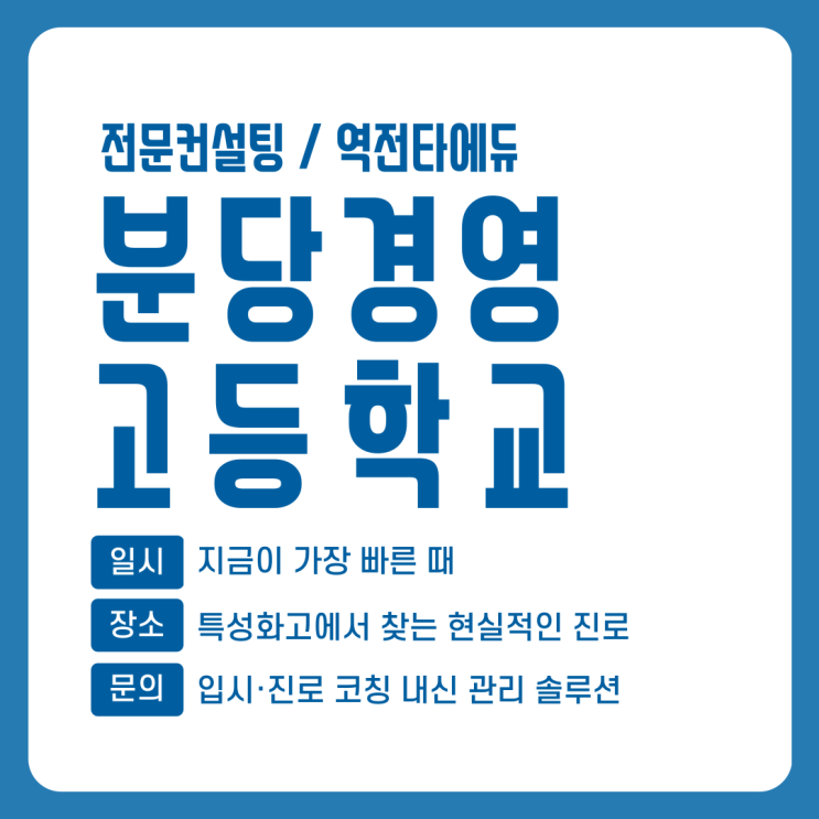 분당경영고등학교 학교 소개 경기도 성남시에 위치한 분당경영고등학교는 변화하는 산업 환경에 맞춘 실무 중심 교육과 진로 맞춤형 교육과정을 운영하는 특성화고등학교입니다. 상업·경영·디지털 기반 학과를 중심으로 학생들의 취업과 진학을 동시에 준비할 수 있도록 체계적인 시스템을 갖추고 있습니다. 학과 안내 ✔️ 회계금융과 기업 회계, 세무, 금융 실무 중심 교육을 통해 전산회계, 전산세무, ERP 등 자격증 취득을 목표로 합니다. 기업 실무 역량과 컴퓨터 활용 능력을 함께 기를 수 있습니다. ✔️ 스마트경영과 경영관리, 마케팅, 사무행정 분야를 기반으로 디지털 비즈니스 환경에 맞춘 실무 교육을 진행합니다. 금융권....... <img src="https://blogthumb.pstatic.net/MjAyNjAyMjZfMTgx/MDAxNzcyMDY4MTMzMjM2.b5h5KU-3xTZa6K23VLXFw09sDAFtHlBR2e0uTrWUUTUg.eanjjcqdimBAcnqdabFgvnkZRPIOuEncnT03nsbSFccg.PNG/%BA%D0%B4%E7%B0%E6%BF%B5%B0%ED%B5%EE%C7%D0%B1%B3.png?type=s3" />