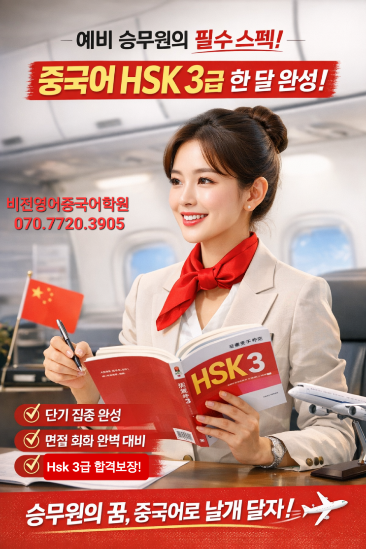 승준생 여러분 니하오~ 2026년 상반기 공채일정이 하나 둘 올라오네요. 파라타항공, 에어프레미아항공 접수 하셨나요? 승준생 모든여러분의 좋은 결과 기원합니다. 최근 한중 교류 활성화로 중국어 가능자를 찾는 항공사가 점점 늘어나고 있는것 아시죠? FSC뿐만 아니라 LCC항공사에서 중국어 가능자 HSK소지자들의 취업확률이 점점 높아지고 있습니다. 여대생들의 꿈, 승준생들을 위한 단기 HSK 합격보장반을 소개합니다. ✈️ 승무원 준비생 필수 스펙! ✔️중국어 HSK 3급, 한 달 완성 ✔️면접에서 바로 쓰는 실전 중국어 ✔️단기간·집중관리·취업 맞춤 커리큘럼 제로베이스 HSK3급 한달 가능한가요? 넵! 한달 가능합니다. 학원에 방문....... <img src="https://blogthumb.pstatic.net/MjAyNjAxMTVfMjkg/MDAxNzY4NDA0MTc1OTE5.KHhBQrXtBjWGhdLHhoyh39f9VJABp08mm1mId97qCK0g._mILD511XEX083C65BkeCvhYJPiST3REvTJ7q3BbFmAg.PNG/900%A3%DFfile%A3%DF000000000e9c71fda1265691acdfbbdd.png?type=s3" />