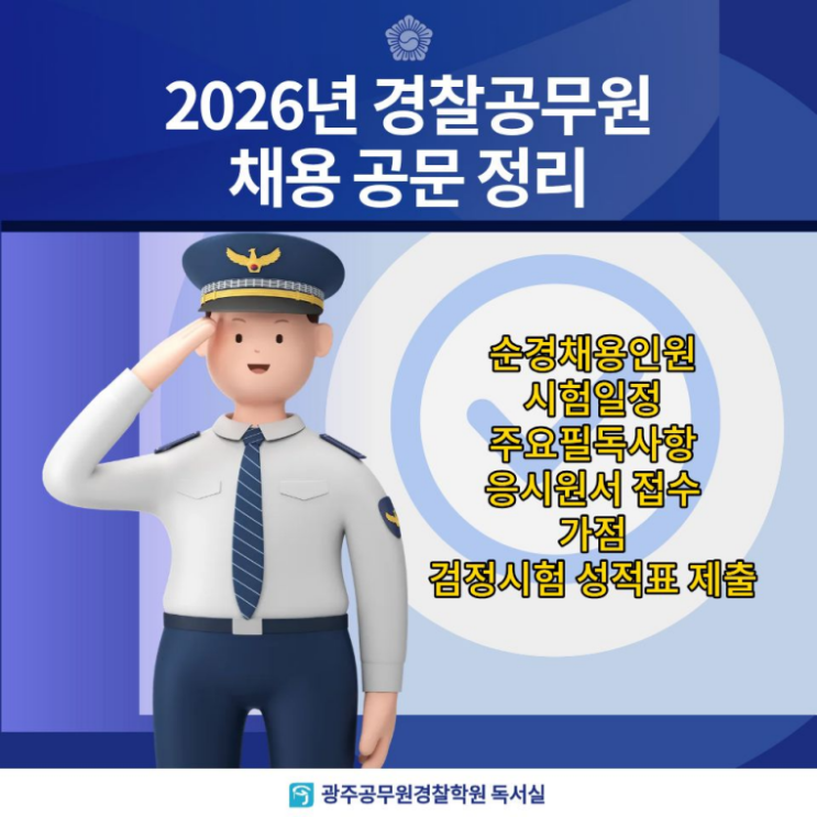 안녕하세요! 전대후문 가성비 관리형독서실 광주공무원경찰학원 입니다! 오늘은 2026 경찰 공무원 채용인원 및 시험일정, 그외 주요 안내사항들을 정리해드리겠습니다! 채용분야 및 인원: 2개 분야(일반, 101경비단) 광주 지역 일반 순경: 37명 시험 절차 및 일정 ※ 필독 주요 안내사항 응시원서 접수/가점/검정시험 성적표 제출 <원서 접수 기간> 2026.2.6(금)~ 2.19(목) 18:00 (14일간) 광주공무원경찰학원 관리형 독서실 ; 노량진학원의 시간표와 노하우가 집약된 관리형독서실 전대후문 근처, 북구청 맞은 편 ● 철저한 노량진식 스파르타 관리 시스템 (출석체크, 휴대폰 수거, 시간표제 운영) -입실 시간에 입실하지 않을 시 연락 조....... <img src="https://blogthumb.pstatic.net/MjAyNjAyMTFfOCAg/MDAxNzcwNzcxMTE5MDQ0.oFyNdy2vMzM7v5pZ5_TuUBRXpLXlzg0CP3zSIOFmeZAg.Er-JcoYDvuOTeOkmqM2Ayi9t4m2uZbRPivaETvOdwecg.PNG/image.png?type=s3" />
