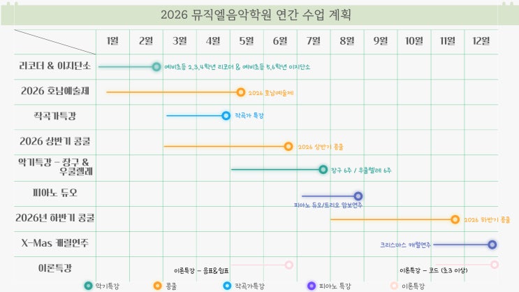 벌!써! 어느새!! 2026년 새해가 밝아왔습니다. 뮤직엘음악학원은 올 한 해에도 배움의 즐거움과 성장이 이어지도록 정성을 다해 지도하겠습니다. 2026년 수업계획표와 함께 수요특강 몇 가지 주요사항과 올해 달라지는 점 안내드립니다. 올해부터는 일반반 친구들도 상반기콩쿨 참가신청을 받습니다. 6월 콩쿨 출전을 목표로 2월 중에 안내문 드릴 예정입니다. 학원 겨울방학기간은 1월 26일(월)~28일(수)입니다. 방학기간 학원 내부 인테리어공사가 예정되어 있습니다. 더 멋지게 바뀔 뮤직엘공간을 기대해주세요 학교 방학기간 뮤직엘 수업시간은 오후 1시부터 7시입니다. (수업 준비를 위해 12시....... <img src="https://blogthumb.pstatic.net/MjAyNjAxMDJfMjcx/MDAxNzY3MzMzNDYyNzMy.M_5Zt_86SKzqP8yE4yb5FuHF0foEXNvJuLmXZaY4ANQg.OvQc49nTU_BGXBYNwCZ7GHYHc84n1Md2y2py2zmnzbMg.JPEG/%C1%A6%B8%F1%C0%BB-%C0%D4%B7%C2%C7%D8%C1%D6%BC%BC%BF%E4_-001_%2814%29.jpg?type=s3" />