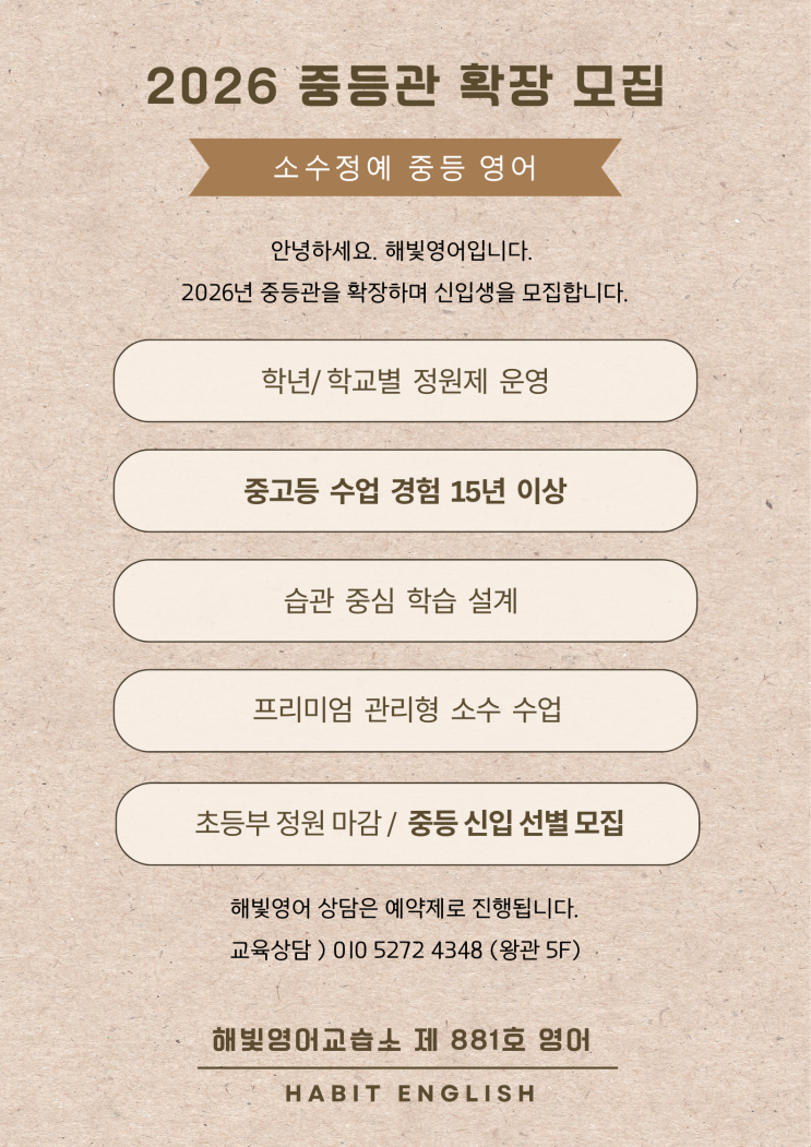 파닉스 집중 코스 모집 학원을 1년 다녀도 영어를 제대로 못 읽는 아이들을 위한 집중 파닉스 코스(3개월과정) ->기존 영어 노출이 있는경우에 가능 “외우기만 했지, 읽지는 못해요…” 이제 소리 원리부터 다시 잡아줍니다. ✔ 이런 학생을 위한 수업입니다 • 영어 학원을 오래 다녔지만 읽기 어려운 학생 • 알파벳은 아는데 단어를 못 읽는 학생 • 파닉스가 헷갈려 자신감이 없는 학생 ✔ 수업 특징 • 소리 중심 파닉스 재정비 • 반복 · 누적 학습으로 읽기 습관 형성 • 짧은 문장까지 자연스럽게 읽기 완성 ✔ 기대 효과 • 단어를 스스로 읽는 힘 • 발음 · 철자 · 읽기 동시 향상 • 영어에 대한 자신감 회복 문의: ....... <img src="https://blogthumb.pstatic.net/MjAyNjAxMDdfMTUy/MDAxNzY3NzkxMjg3NDY5.URMLNSvA7iAHrAcbZvNoJp9wOljUdgROF0H5EpIvYz4g.ZNmhfs-3-L2gnRXux6kwChKsg8SK9skTJAHpjpuM53Ag.JPEG/IMG%A3%DF3458.jpg?type=s3" />