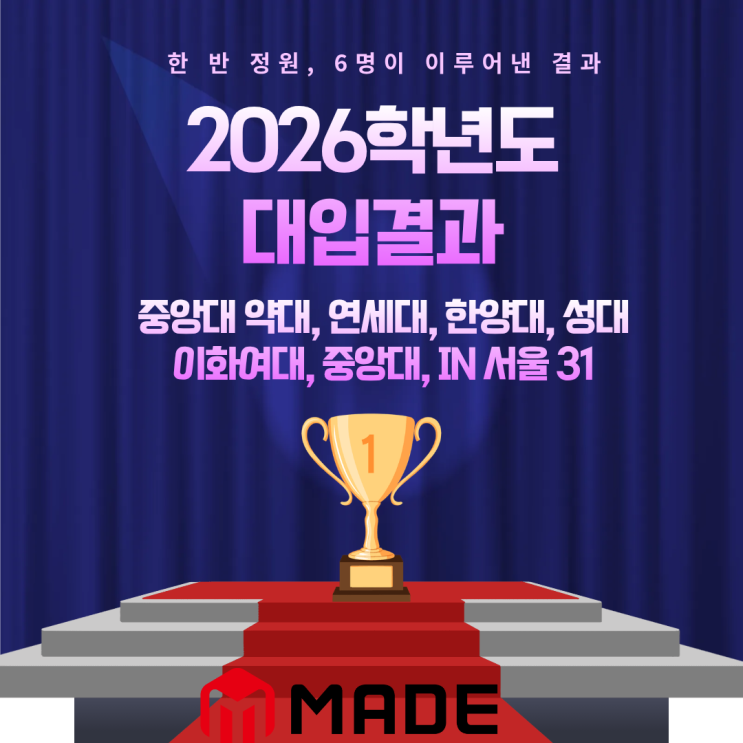 분당입시학원 2026학년도 대입 결과 [메이드학원 2026 대입 합격 결과 안내] 분당입시학원이 2026학년도 대입에서 중앙대 약대를 비롯해 연세대, 한양대, 성균관대, 중앙대, 이화여대 등 서울 주요 대학 31명, 수도권 대학 26명 합격이라는 뜻깊은 성과를 거두었습니다. 이러한 결과가 더욱 소중한 이유는 한 반 정원 6명의 소수 정예 수업 안에서 일구어낸 결실이기 때문입니다. 사실 고3 시기에 저희 학원을 찾는 학생들은 이미 완성된 최상위권보다, 스스로 부족함을 느끼고 실력을 비약적으로 끌어올리고자 하는 경우가 많습니다. 그럼에도 불구하고 학생들의 끈질긴 노력과 학원의 세심한 밀착 지도, 철저한 관리가 시너지를 내며 기대 이상....... <img src="https://blogthumb.pstatic.net/MjAyNjAzMTJfMTUz/MDAxNzczMzA4NzI2NTc5.BxPdQHylA_INNFfNgLtrB71MKAYOJZbRUkFz_kZn8EEg.6lLpXzD9_WR4K0o_AxwRS4LzQmiYu7BTuHJP5HiZEn0g.PNG/%B4%EB%C0%D4%B0%E1%B0%FA.png?type=s3" />