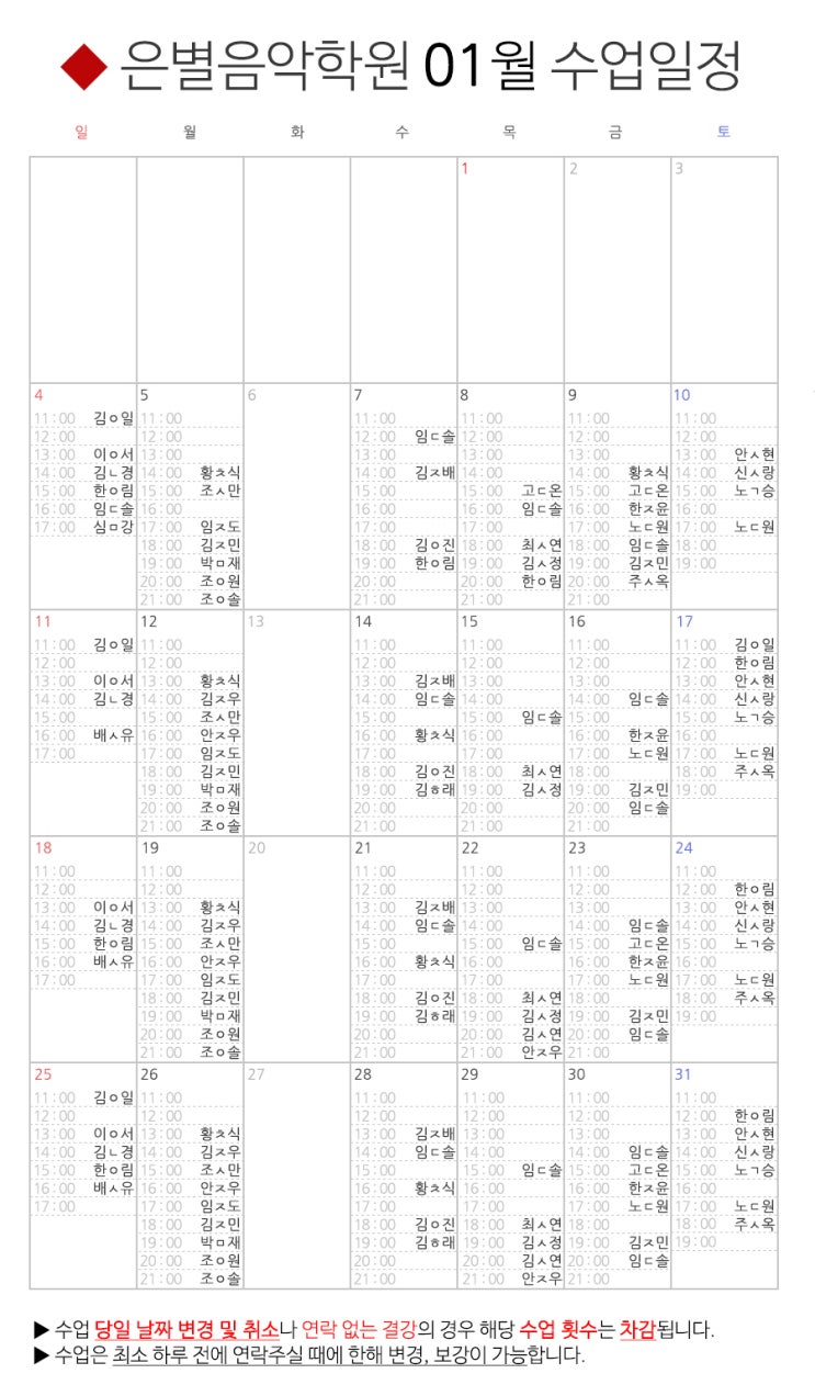 안녕하세요. 의정부기타학원 은별음악학원 입니다. ▶ 기타, 베이스, 우쿨렐레 정규수업 수강료 주 1회(50분) 월 4회 기준 150,000원 / 주 2회(40분) 월 8회 기준 200,000원 ▶ 학생대상 방학특강 수강료 주 2회(30분 개인레슨/30분 개별연습) 월 8회 기준 170,000원 주 2회(30분 개인레슨/30분 개별연습) 월 12회 기준 250,000원 ▶ 수업은 수강료 납부 확인 순으로 배정되며, 구두 예약의 경우 해당 시간이 마감되어 일정에 변동이 생길 수도 있습니다. * 은별음악학원은 난이도, 연령 별 차등없이 동일한 금액으로 진행됩니다. 2026년 01 수업 일정 안내드립니다. 수강생분들의 스케줄 변동이 잦다 보니 일정이 바뀔 수 있습니다. 위 시간표를....... <img src="https://blogthumb.pstatic.net/MjAyNjAxMDlfMjYz/MDAxNzY3OTM4MTE1ODgw.FfQ4QAqpLjzC200mGV119RAuxm1p7UFRbjbEhv81HO0g.Bemb7W9jLqDBBYQ2Ibh2ptZUrvI0ZAEauufqwKy96AAg.JPEG/%C0%BA%BA%B01%BF%F9.jpg?type=s3" />