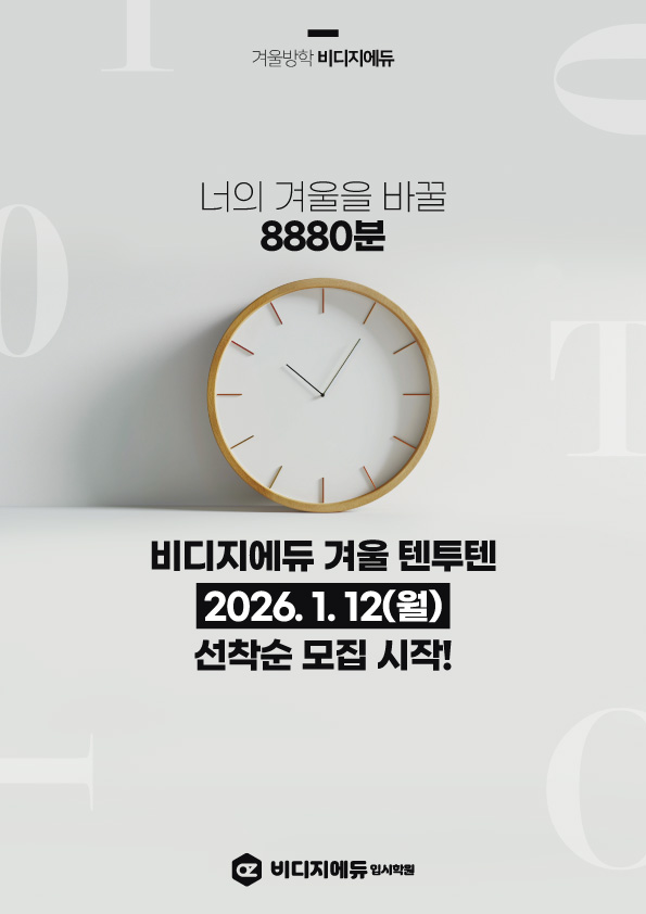 안녕하세요-! 비디지에듀입니다 겨울방학이 다가왔습니다!!! 이번 방학, 학습 전략은 준비되셨나요? 총 5주 / 148시간 / 8,880분 지금까지와 다른 겨울을 만들어드립니다. ✔️ 1차(1/12~1/30) ✔️ 2차(2/2~2/20) ✔️ 학습 집중 + 습관 만들기 ✔️ 선착순 모집 중! 너의 겨울을 바꿀 준비, 되었나요? 제 8회 겨울방학 텐투텐 안내 ❄️ 겨울방학, 단순 휴식이 아닌 도약의 시간으로! 겨울방학은 단순한 휴식이 아니라 내신, 수능 대비와 자기주도학습 실력 향상을 위한 기회입니다. ✨ 비디지에듀 겨울 텐투텐 프로그램은 오전 10시부터 밤 10시까지, 스스로 계획하고 실천하는 자기주도 학습 시스템입니다. 이번 겨울방....... <img src="https://blogthumb.pstatic.net/MjAyNjAxMDJfNjYg/MDAxNzY3MzMyMjE0MDY0.U3URAZbMwANm2HuU9lcW951rQvYZlazsuqylWo8fY0Ig.ExSGL-Gr5WB-dywfXygcKGFIlakIRkKfbqkl419FFwMg.JPEG/2026_%C5%D9%C5%F5%C5%D9-%B0%DC%BF%EF-%B1%A4%B0%ED1.jpg?type=s3" />