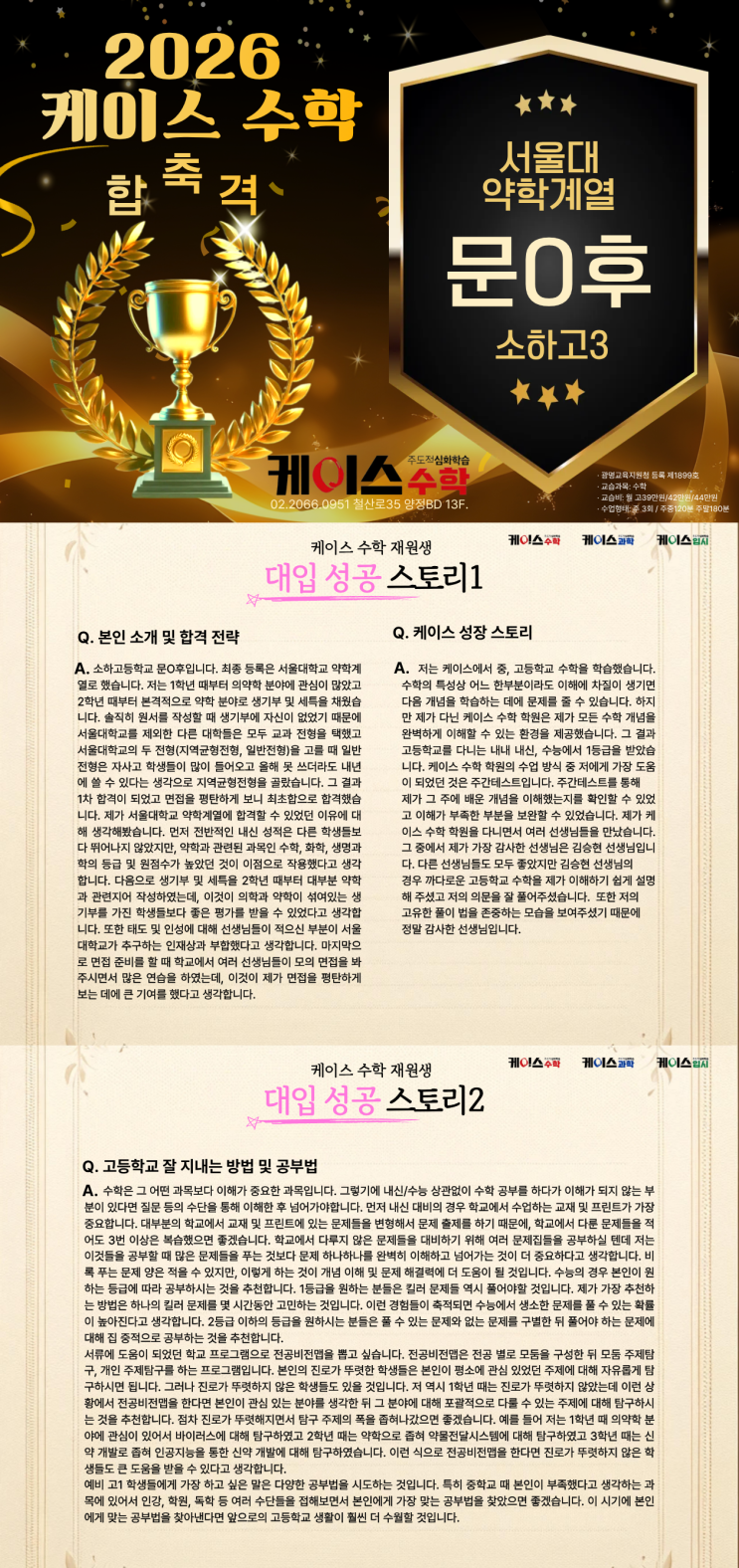 안녕하세요. 케이스수학학원입니다.! 2026학년도 대입에서 수시전형 결과가 집계완료되었습니다. 우리학원에서는 합격생의 생생한 합격수기를 받아서 후배들에게 소개를 하고 있습니다. 첫번째 합격수기로 2026년 서울대 약학계열에 입학한 소하고 문0후 학생의 합격수기를 소개합니다.^^ <img src="https://blogthumb.pstatic.net/MjAyNjAxMTVfNjcg/MDAxNzY4NDc4NTA2MTEz.ljsGf624WRjA5wZ9ctCfENO5CxrPmCpST2YsquZYOo4g.8pVU1Tc3uGwAB44jHB05z4UcLFHrsyNF_xhiyhdy1Bog.PNG/%B9%AE%C1%A4%C8%C4_%BC%F6%B1%E2.png?type=s3" />