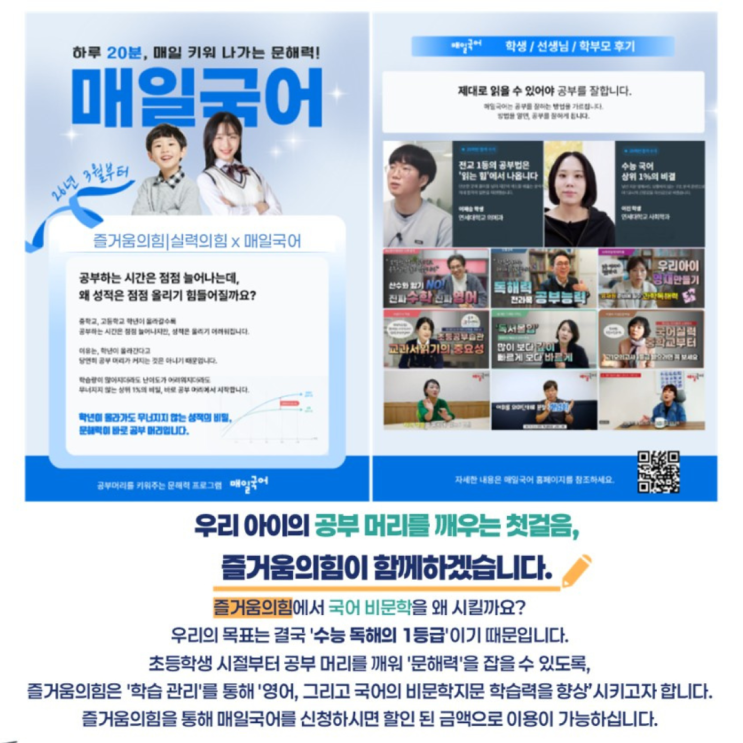 매일국어 대표님과 함께 즐힘& 실힘 아이들을 위한 신학기 이벤트를 준비했습니다. 1개월 [4만원] 3개월 신청 시, + 3개월 무료 [6개월, 12만원] 6개월 신청 시, + 6개월 무료 [12개월, 24만원] 서울대 국어,영어,수학 교육학과 재원생 3인방의 강력 추천이었던 "매일 국어" 우리 아이들의 "매일 독서"를 위해, 즐힘,실힘 친구들과 "매일 국어"를 시작하겠습니다. 초,중등 시기, 매일의 독서가 아이들의 미래를 바꿉니다. 매일 국어,사회,과학 전지문과 심화지문 학습 + 비문학,문학 노출로 아이들에게 많은 도움이 되는 프로그램입니다. 2월 마지막주부터 3월 첫 주(2/23~3/6)는 신학기 매일국어 프로모션 신....... <img src="https://blogthumb.pstatic.net/MjAyNjAyMjZfMTA1/MDAxNzcyMDY3NjYwOTUz.csONuuLhP8mXaFpIgj4ezSqlu1V3GAgs3Om6sxyDa6Eg.if8tmLfXnWAUd6Z-y0AxoFaATauEI8bjk3RkPSeJ9ogg.PNG/%B8%C5%C0%CF%C0%C7_%BD%C0%B0%FC%C0%CC_%B3%AA%B5%B5_%B8%F0%B8%A3%B0%D4_%BB%F3%C0%A7_1_%B4%DE%BC%BA_%282%29.png?type=s3" />