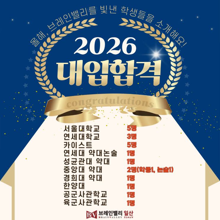 브레인밸리 일산관에서 공부한 학생들의 대입결과입니다. 올해도 어김없이 많은 학생들이 수시와 정시에서 좋은 성과를 올렸습니다. 최고의 강사진과 함께 최선을 다한 브레인밸리 학생들에게 그동안 땀흘려 노력한 결과에 박수를 보냅니다. 또 앞으로 있을 입시를 위해 꿈을 위해 앞으로 나아갈 많은 학생들을 위해 오늘도 브레인밸리 전 강사진은 최고의 프로그램과 최상의 강의로 페이스메이커가 되겠습니다. <img src="https://blogthumb.pstatic.net/MjAyNjAyMDVfMTcy/MDAxNzcwMjg2Mzg3NjY5.rJ_0YZeUSQhPwxZPQTthQVsw-OgENKpwctiI9AL7Qq4g.L-hzvJwYAt4WTllxY45TIiDELeasLKgs1GWp1EqSi-4g.PNG/1.png?type=s3" />