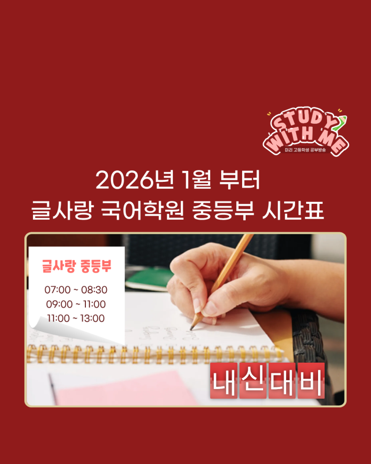 글사랑 국어학원입니다. 겨울방학 중등부 시간표가 확정되었습니다. 글사랑 중등부는 학원 수업만 충실하면 됩니다. 겨울방학 특강은 없습니다. 정규수업과 클리닉수업으로 주 2회만 성실하게 학원에 온다면, 국어를 잘 하는 학생이 될 것입니다. 지난 기말고사에서도 거의 모든 학생이 90점 이상의 성적을 얻었습니다. 기말 지필고사만 100점인 학생도 여러 명입니다. 처음부터 잘 하는 학생들은 아니었습니다. 대부분 첫 시험에 40-50점에 충격을 받고 국어학원에 등록한 학생들이었습니다. 커리큘럼과 자체 교재, 그리고 시험대비 시스템과 선생님이 역량 등이 합쳐진 글사랑 국어의 힘이라고 생각합니다. 이미 여러번 입증된 <글사랑 국어....... <img src="https://blogthumb.pstatic.net/MjAyNTEyMjVfMjAx/MDAxNzY2NjUwNTM5Mjgx.IDXl8xbNIvO1O8XALR9piSZE44wCNpgNW5nLpkRB2TAg.suxXLOWX5l6UXFn5lQqbJUlGOO_THVis0vLXdgmuxlkg.PNG/2026-%B0%DC%BF%EF%BD%C3%B0%A3%C7%A5-%C1%DF%B5%EE.png?type=s3" />