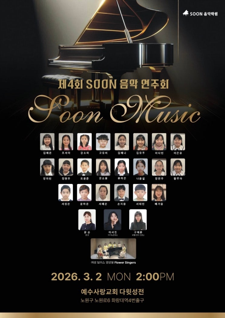 제 4회 SOON 음악 연주회 <img src="https://blogthumb.pstatic.net/MjAyNjAyMTlfNTUg/MDAxNzcxNDg5MjQ5MjA4.nz7F1u3OsUw4lJNaWR_xcZxzrL_OQ_YXrkCphha5QUwg.4Dt_cEvs61WnU7JaajZnINiGggjNdXUr3mwVxrJtrTQg.JPEG/IMG%A3%DF5064.jpg?type=s3" />