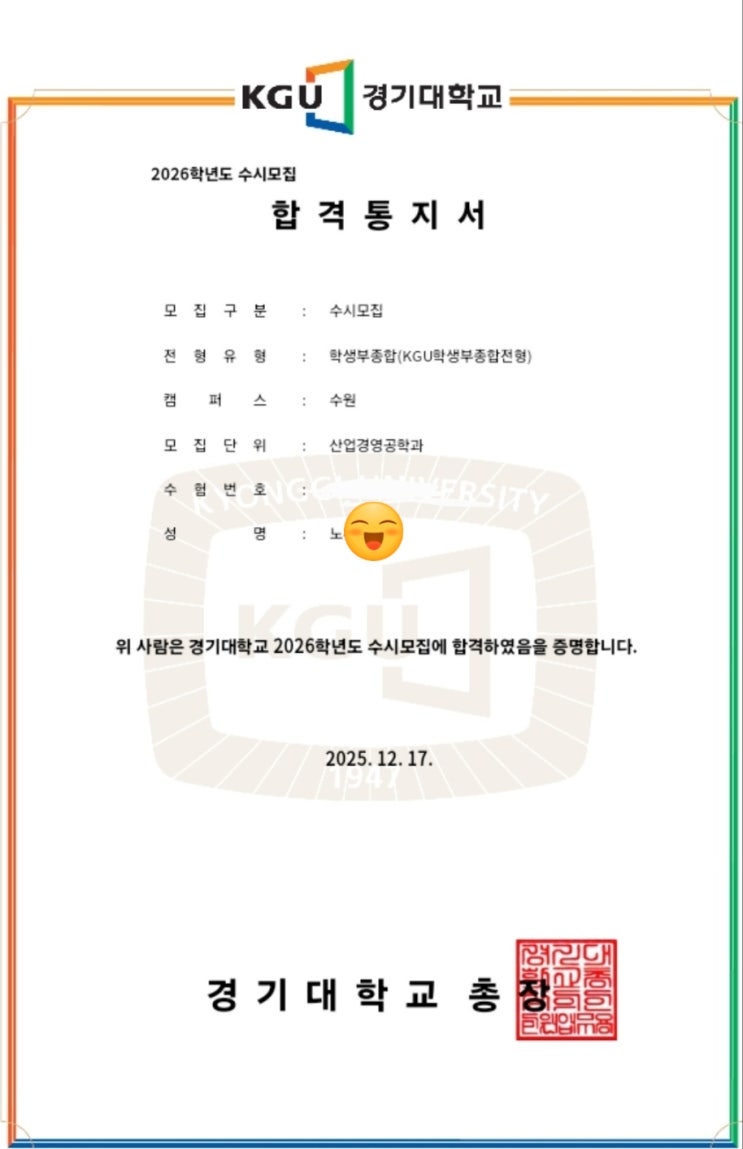 2026학년도 수시 최종합격 결과 2탄! – 메티스학원과 함께한 대입 성공 스토리 – 안녕하세요, 메티스학원입니다. 이번 블로그에서는 많은 분들이 기다리셨던 2026학년도 수시 대입 결과 2탄을 공개합니다! 저희 메티스학원은 단순히 수학·영어 교과 수업에 그치지 않고, 생활기록부 관리부터 수시 6회 지원 전략, 면접 준비까지 대입의 전 과정을 종합적으로 관리해드리고 있습니다. 그 결과, 올해도 수많은 학생들이 자신이 꿈꾸던 대학에 합격하는 기쁨을 누렸습니다. 아래는 메티스의 모든 입시 프로그램에 적극 참여하며 놀라운 성과를 이뤄낸 학생들의 이야기입니다. 1. 노XX – 경기대학교, 한세대학교 합격 메티스에서 무려 5년간 재원....... <img src="https://blogthumb.pstatic.net/MjAyNTEyMjRfMjgx/MDAxNzY2NTc2MzE0OTM2.dJQD1-NVkWKZBydUQdMvcxDOhll7g1OBgO432T_jNrUg.E6RV29gXKLTMTHqlDYIFekwwLMdYL7TVueTY7ObMGr8g.JPEG/KakaoTalk_20251217_182516530.jpg?type=s3" />