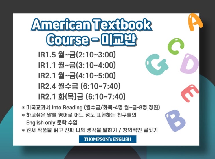 안녕하세요 <영어는 언어다!> 탐슨어학원입니다 문법플러스반을 제외한 모든 반은 원어민 담임선생님의 전담수업으로 진행됩니다 영어를 처음 시작하는 친구들을 위한 파닉스+스피킹 시작반이 11월28일 개강합니다 본격연습반은 현재 마감되었으며 마무리반은 간단한 파닉스 테스트를 거쳐 입반 가능합니다 ▶ 영어를 처음 시작하는 단계 ◀ 파닉스+스피킹반 (원어민100%) ▶영어를 읽고 문장만들기를 시작하는◀ ESL반 (원어민100%) ESL반에서는 꾸준히 문장만들기/글쓰기를 연습합니다 ▶ 원어민 수업과 함께 문법의 큰 그림을 배우는◀ ESL PLUS반 중등 1~3학년 문법 과정을 뼈대로 문법의 기초를 배운 뒤 리딩 지문을 정확히 이해하고....... <img src="https://blogthumb.pstatic.net/MjAyNjAxMTBfMjYg/MDAxNzY3OTc2MTc4OTMx.l-wQ8z4pHatHkpEHcUcChtkSK1T-SNJpK6F_7pGWQ5cg.gDKFcYCCEp4h1yWduNLeZ4ybIWO8juNSQBDKlHn4ii4g.JPEG/900%A3%DF005.jpg?type=s3" />