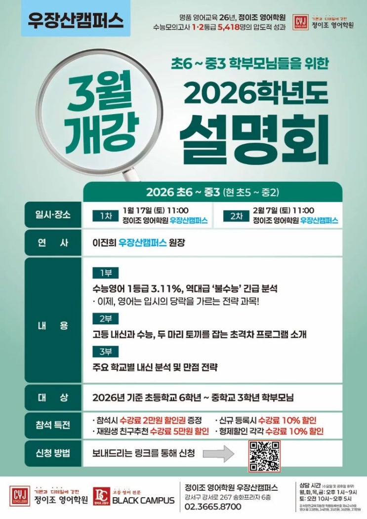 https://forms.gle/KBNLCMzx5xvKGAau9 안녕하세요~ 정이조 영어학원 우장산 캠퍼스입니다! 정이조 영어학원 우장산캠퍼스에서는 2026학년도 새 학년 을 준비하는 초6 ~ 중3 학부모님을 대상으로 2026학년도 영어 학습 로드맵을 한 번에 정리해드리는 설명회를 준비했습니다! ✔ 수능 영어 1등급 비율 3.11% ✔ 내신과 수능, 어느 하나도 놓칠 수 없는 구조 이제 영어는 감으로 공부할 수 있는 과목이 아닙니다. 정확한 분석과 선제적인 전략이 필요합니다! ✔ 고등 내신과 수능을 동시에! 정이조영어학원의 초격차 프로그램은 과연 무엇인지 우리 아이가 다가올 2026년 새 학년에서 어떤 준비가 필요하고 언제 무엇을 해야 하는지를 차분하....... <img src="https://blogthumb.pstatic.net/MjAyNjAxMDVfMjAg/MDAxNzY3NjIxNjc5ODE0.ZeNRaF6p6tWTlosru9FieOSQBwHCZjDHussKX-r9KFog.yXM6z3lYUbiV7fjItymFnX6IJwSyxo_eZVSOY2yuoZcg.JPEG/1.jpg?type=s3" />