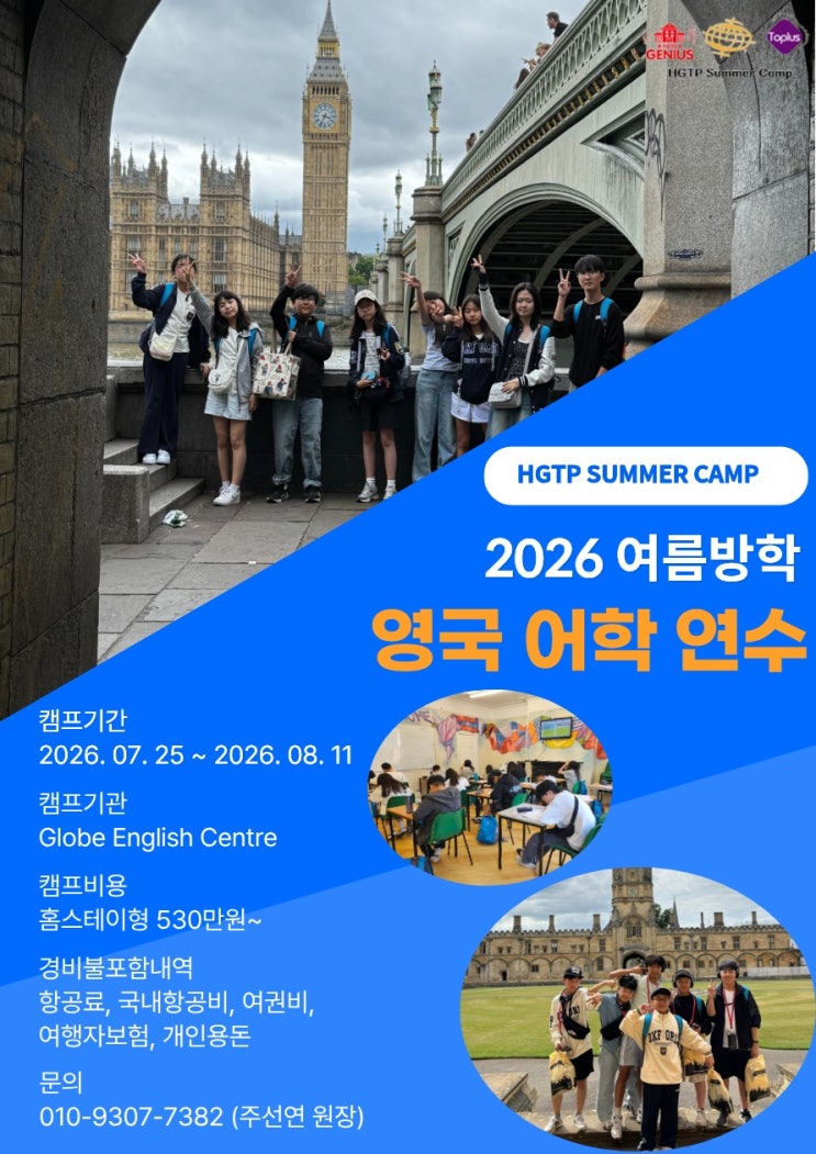 2026년 여름방학 기간 동안 토프러스 본사에서 진행하는 단기 영국 어학연수 프로그램이 있어 안내드립니다. 관심 있으신 학부모님께서는 아래 내용과 첨부된 안내문을 참고해 주시기 바랍니다. 캠프 기간 2026년 7월 25일 ~ 2026년 8월 11일 캠프 기관 Globe English Centre British Council 인증 영어교육기관 대상 초등 4학년 ~ 중등 3학년 (초등 저학년은 부모 동반 참여 가능 -별도 문의) 프로그램 구성 오전 영어 수업 (9:30~13:00) 오후 Activity 프로그램 (14:00~) 런던 및 옥스퍼드 문화 체험 예상 비용 홈스테이형의 경우 약 530만원 수준 ※ 항공료, 여권비, 여행자보험, 개인 용돈 등은 별도입니다. ※ 인천 지역 캠퍼스 학생들은 인....... <img src="https://blogthumb.pstatic.net/MjAyNjAzMTFfMjcg/MDAxNzczMjA1MTQ2MjM2.6L0-X0aJm_TQqF_4fh7y06uav1nAizx-svVxFjr4jncg.g2EOskDVXej_uGMAhOFXRM-ohZzPIq1NvNH5NhN0Md4g.JPEG/KakaoTalk_20260311_104100027.jpg?type=s3" />