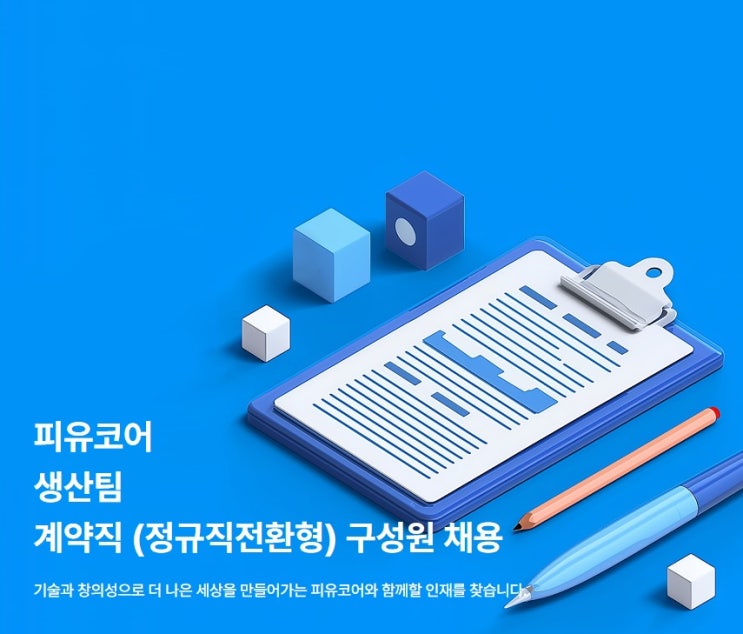 피유코어 생산직 계약직 채용 요약 피유코어는 현재 생산팀 계약직 채용을 진행하고 있으며, 해당 채용은 근무 평가를 통해 정규직 전환이 가능한 구조로 운영 됩니다. 모집 직무는 생산팀으로, Polyol 제품 생산 및 혼합을 비롯해 원료 이송 · 투입, 품질 관리, 현장 정리정돈 등 제조 현장 중심의 생산 업무를 담당하게 됩니다. 지원 대상은 신입 및 경력 5년 이하이며, 4조 2교대 근무가 가능한 인원을 줌심으로 선발이 이루어집니다. 생산팀 채용 부문 및 담당 업무 이번 채용은 생산팀 신입 인력 중심으로 진행됩니다. 주요 담당 업무는 다음과 같습니다. · polyol 제품 생산 및 혼합 작업 · 탱크로리 및 컨테이너 운송 관리 · polyol 품질....... <img src="https://blogthumb.pstatic.net/MjAyNjAyMTlfMTEw/MDAxNzcxNDg0MDMyNTg4.OUagPF-XYBV10990uObxnLb8SwBQXnfTxvVe032ET58g.V7Y6NSxrIra8jA4mR1fmzpusTV43yNHnWVSPb1FUS70g.JPEG/%C7%C7%C0%AF%C4%DA%BE%EE_%BB%FD%BB%EA%C1%F7_3.jpg?type=s3" />