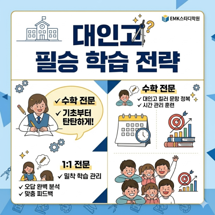 안녕하세요, 인천 서구 심곡동에서 대인고등학교 내신을 정밀 분석하고 지도하는 EMK스터디학원입니다. 대인고등학교에 진학한 후 첫 시험을 치른 학생들과 학부모님들이 가장 많이 하시는 말씀이 있습니다. "중학교 때까진 90점 밑으로 내려간 적이 없는데, 왜 고등학교 점수는 이 모양이죠?" 대인고 내신은 중학교 시험과는 차원이 다릅니다. 오늘 EMK에서는 대인고 수학/영어 등급 컷을 가르는 결정적 차이를 전격 분석해 드립니다. 1. [수학] 시간 싸움과 '킬러 문항'의 한 끝 차이 대인고 수학 시험은 단순 암기나 연산만으로는 절대 상위권을 유지할 수 없습니다. * 변별력 문항의 위치: 대인고 수학은 객관식 마지막....... <img src="https://blogthumb.pstatic.net/MjAyNjAzMTVfMTI5/MDAxNzczNTA4NjE0MDIx.Tn5WY4ZARchk8BhLx_OFgj-Iy0v61HfM5AW62ogHKWgg.-CDB4I_kgZUaEur-kD90jCJ7FlvCZzqYbh_tycX467Yg.PNG/900%A3%DF1773508591026.png?type=s3" />
