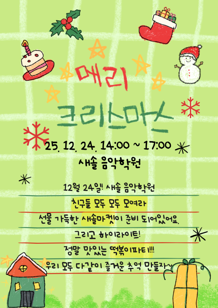 안녕하세요 두루숲음악학원이에요 어느덧 25년의 마무리가 다가왔네요 ☃️ 추운 이 날, 크리스마스 이브에 우리 두루숲 친구들을 위해 따뜻한 어묵과 재미있는 방탈출을 준비해보았답니다 <세종음악학원><고운동피아노><크리스마스음악특강> 미리 힌트들을 공부하고 당일에는 각 방 마다 즐거운 퍼즐찾기와 퀴즈, 음악놀이들을 넣어 맞추고 나와야하죠 즐거움이 가득한 현장이 보이시나요♡ 올 한 해 선생님들의 수업과 음악활동으로 풍부한 경험과 음악적 감각이 넘쳐났길 바래봅니다!! 항상 기쁘게 참여해주고 열정적인 우리 두루숲 친구들 고마워요 <두루초피아노><두루유치원피아노>&....... <img src="https://blogthumb.pstatic.net/MjAyNTEyMThfMTg3/MDAxNzY2MDMzNjM2NzA0.haatr_R7ZVUAI-oNeOdPHs1WxGErSutN10_-pycptbkg.Lm3fINgBFDUMIkpTLsvY3mK7-pzRz-dTeYmmIIJ2PtMg.JPEG/1766033540537.jpg?type=s3" />