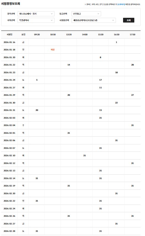 세종시컴퓨터학원-유캔컴퓨터학원은 겨울 방학을 맞아 국가 기술 자격증에 도전하는 분들이 등록하고 있습니다. 이제 2월 상시 시험 일정이 나왔습니다. 빠른 시간에 등록하시고 준비하시기 바랍니다. <img src="https://blogthumb.pstatic.net/MjAyNjAxMTJfMTM4/MDAxNzY4MjEwOTQ2ODgz.d_tmkR27O3yvovydJrK5DdHeqVVx6XhwTaUAesd_mKMg.BhLU1ByrUwl27Oz4Xg4cxq7Kh_ueEIzRHc4m0JZwnrAg.JPEG/01.jpg?type=s3" />