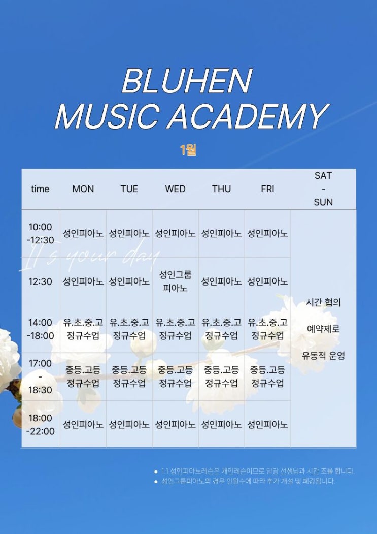 ✨ 블루헨음악학원 1월 전체 시간표 안내 ✨ 1월 레슨 일정 정리해두었습니다. 아이부터 성인까지, 수준과 목표에 맞춰 꼼꼼히 진행합니다. 문의는 편하게 연락 주세요 #블루헨음악학원 #평택피아노 #동삭동피아노 <img src="https://blogthumb.pstatic.net/MjAyNTEyMjZfMTQy/MDAxNzY2NzMwNTUyODIx.-XOdoFgG38TSQwige8UFi7zqoKPjinqyiTenwcAGw5sg.XL2RHqgxHkbcDQD-vfAXflirsKAS3nhjbV_RqdeGsN4g.JPEG/IMG%A3%DF1081.JPG?type=s3" />