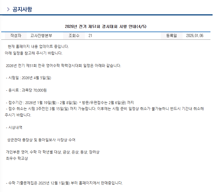 안녕하세요~ 파주에 위치한 심화 사고력 수학학원 필즈더클래식 파주운정센터입니다. 2026년 성대경시 전기 일정이 업데이트가 되어서 공유 해드립니다. 더 자세한 내용을 보고 싶으신 분들은 밑에 기재된 링크 참고 해주세요!! 성대경시 홈페이지↓↓↓↓↓↓ <img src="https://blogthumb.pstatic.net/MjAyNjAxMDZfNzMg/MDAxNzY3Njk1MDQxNjQ1.aCZzoZ3l41weBUAKGU11nZA-XYZEzdPfw9mw3Kgdz7Yg.BtlSuCEbObmE-QgO_oBsSVpteut05PcHwzlh08J6HzUg.PNG/%C8%AD%B8%E9_%C4%B8%C3%B3_2026-01-06_192302.png?type=s3" />