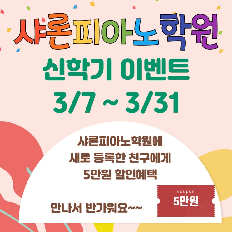 안녕하세요 샤론음악학원입니다 작년에 샤론음악학원의 25주년 기념으로 3월 한달간 신입생들과 소개해주신 샤론의 학부모님분들께 교육비 5만원 할인이벤트를 했었는데요, 4월까지 이벤트 문의가 많았던 이벤트였답니다 얼마 전 학부모님께서 이 할인이벤트에 대해 문의를 해주셔서 올해에도 신학기 이벤트를 하려합니다 3월 한 달간 샤론음악학원에 등록해주시는 모든 분들께 첫 달 교육비 5만원 할인이벤트를 합니다~ 아래의 링크를 눌러주시면, 샤론의 모든 것을 아실 수 있습니다! 꼭 눌러서 봐주시면, '샤론'을 더 신뢰하실 수 있을거라 확신합니다~ 피아노 교육에서부터 다양한 교구수업과 연주회 및 콩쿨 경험을 모두 만날 수....... <img src="https://blogthumb.pstatic.net/MjAyNjAzMDhfMjQg/MDAxNzcyOTY4Mjk1ODEy.FwjA6m6gQ358LVHudOxECpA7yRGLMCiGTkPPE2N55hIg.zhjDqDGDvuuWebEAy2ev7NslgrBH3TLA_hVRbLNwGCUg.JPEG/%B8%AE%BA%E4%C0%CC%BA%A5%C6%AE-006.jpg?type=s3" />