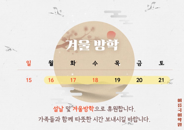 안녕하세요 여름;국어 입니다 :) 설은 한 해가 시작되는 음력 1월 1일인 새해 새 달의 첫 날로 우리나라 한 해의 최초 명절이라는 의미를 담고 있습니다. 2026년의 새 날을 가족들과 함께 보내며, 따뜻한 시간을 보내시길 바랍니다. ▶ 자세한 상담 & 문의시 어디로 연락하면 되나요? T. 031-8049-8939 H. 010-9570-7780 <img src="https://blogthumb.pstatic.net/MjAyNjAyMTBfMjAw/MDAxNzcwNzA2MzQxMzYy.3_OFCiyxg8jwknxb_BiMeJSKv7bCZFWVmTswKUXzbecg.-PLfAwyOud9_ups_68andX4XrGOeoY1vDKk5cI4j7DIg.JPEG/2026_%B0%DC%BF%EF%B9%E6%C7%D0_%BE%C8%B3%BB.jpg?type=s3" />