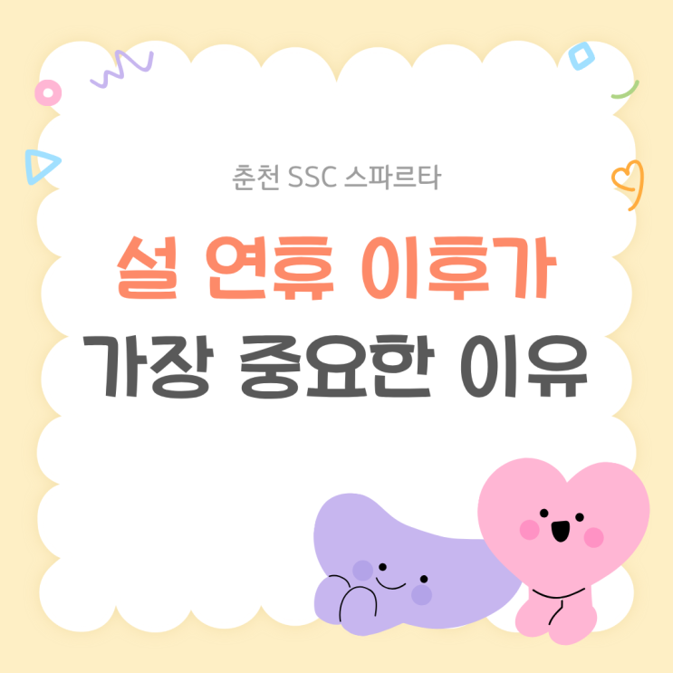 안녕하세요! 춘천 공무원학원 SSC 스파르타입니다. 설연휴가 끝났습니다. 가족을 만나고, 잠깐 쉬고, 마음도 조금은 풀어졌을 텐데요. 문제는 그 이후입니다. 다시 책상 앞에 앉았지만 집중이 예전 같지 않고, 리듬이 끊긴 느낌이 들고, 괜히 불안만 커지는 시기죠. 이럴 때 많은 수험생들이 혼자 다시 버텨보려다가 더 흔들리게 되는데요. 그래서 설 이후 시점에 춘천 공무원학원 SSC 스파르타를 찾는 수험생이 늘어나고 있어요. 설 이후가 위험한 이유 공무원 시험은 장기전이라고 볼 수 있어요. 물론 연휴 한 번으로 합격이 좌우되지는 않죠. 하지만 흐름이 끊긴 상태를 방치하면 그 여파는 생각보다 오래 가요. 기상 시간이 밀리고 공부 시작....... <img src="https://blogthumb.pstatic.net/MjAyNjAyMjBfODIg/MDAxNzcxNTY0MDYyMzgx.TUQonfBDsJkLi6sm9_a7O21jZcOMJdOO-i37HZSpolgg.ZCGO7IZnlvM9jB17v5WNTjCkfTa9f1jtIxNwKsJ90sAg.PNG/1.png?type=s3" />