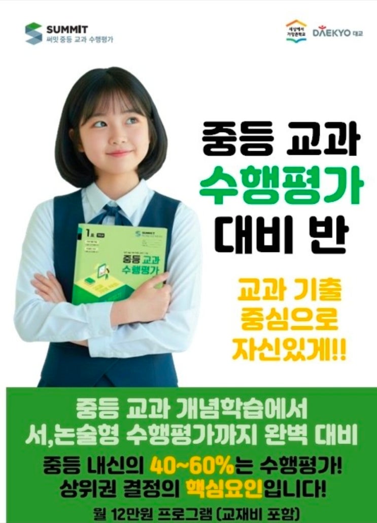 중1 자유학기제, 지금이 수행평가 준비의 골든타임입니다. 3월부터 중등 수행평가 대비반을 시작합니다. 중학교 1학년 1학기는 자유학기제입니다. 지필고사가 없기 때문에 많은 학부모님들이 "시험이 없으니 조금 쉬어가도 되지 않을까?" 생각하시기도 합니다. 하지만 현실은 다릅니다. 지필평가에서 90점 이상을 받고도 수행평가 때문에 B를 맞는 안타까운 친구들이 발생하기도 합니다. ✔ 중등 내신의 40~60%는 수행평가 ✔ 상위권 결정의 핵심요소 ✔ 논술형 · 서술형 · 발표 · 프로젝트형 확대 자유학기제는 쉬는 학기가 아니라 수행평가 실력을 준비하는 학기입니다. 왜 1학년 1학기가 가장 중요할까요? ✔ 수행평....... <img src="https://blogthumb.pstatic.net/MjAyNjAzMDFfOTUg/MDAxNzcyMjk3NjMyNTU0.Ytq85Owav7FaLLKXs5uwAS5XjzOcSRZ-HRx12s-VnxQg.lk9_WWxXUlCU8K3SF3yJTLRBBM12vCMsr9ZDU0EiYEUg.JPEG/900%A3%DFScreenshot%A3%DF20260301%A3%DF012741%A3%DFKakaoTalk.jpg?type=s3" />