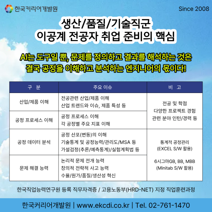 안녕하세요 한국커리어개발원입니다. 2026년 상반기 취업준비를 위해 이공계 전공자 모두가 대기업 취업을 위해 바쁜 시간을 보내고 있을 듯 싶습니다. 관련하여 생산관리, 품질관리, 공정기술 직군에서 엔지니어에게 요구되는 가장 중요한 본질적 직무 역량에 대한 의견을 남겨 봅니다. 1. 산업 및 제품에 대한 이해 본인의 전공과 관련된 산업에 대한 트랜드와 최근 이슈에 대한 이해 입사 지원하는 기업의 제품에 대한 이해와 특성 및 각종 스펙 그리고 경쟁력에 대한 이해 2. 공정 프로세스에 대한 이해 공정 프로세스의 전체적인 흐름에 대한 이해 각 공정별 주요 목적과 특징 및 주요 관리 지표에 대한 이해 3. 공정데이터 분석 능력 공정....... <img src="https://blogthumb.pstatic.net/MjAyNjAyMjZfMjg1/MDAxNzcyMDk0MTExMzY2.mbaPMRwNbEepKxMuZDSPtghprZkat0fksxBV_bUa4eQg.qtC8wK3n-YN5PCTT8hL-9cT5X-0yYtlTNG-mpuOTg70g.PNG/%C0%CC%B0%F8%B0%E8_%C3%EB%BE%F7%C1%D8%BA%F1%C0%C7_%BA%BB%C1%FA.png?type=s3" />