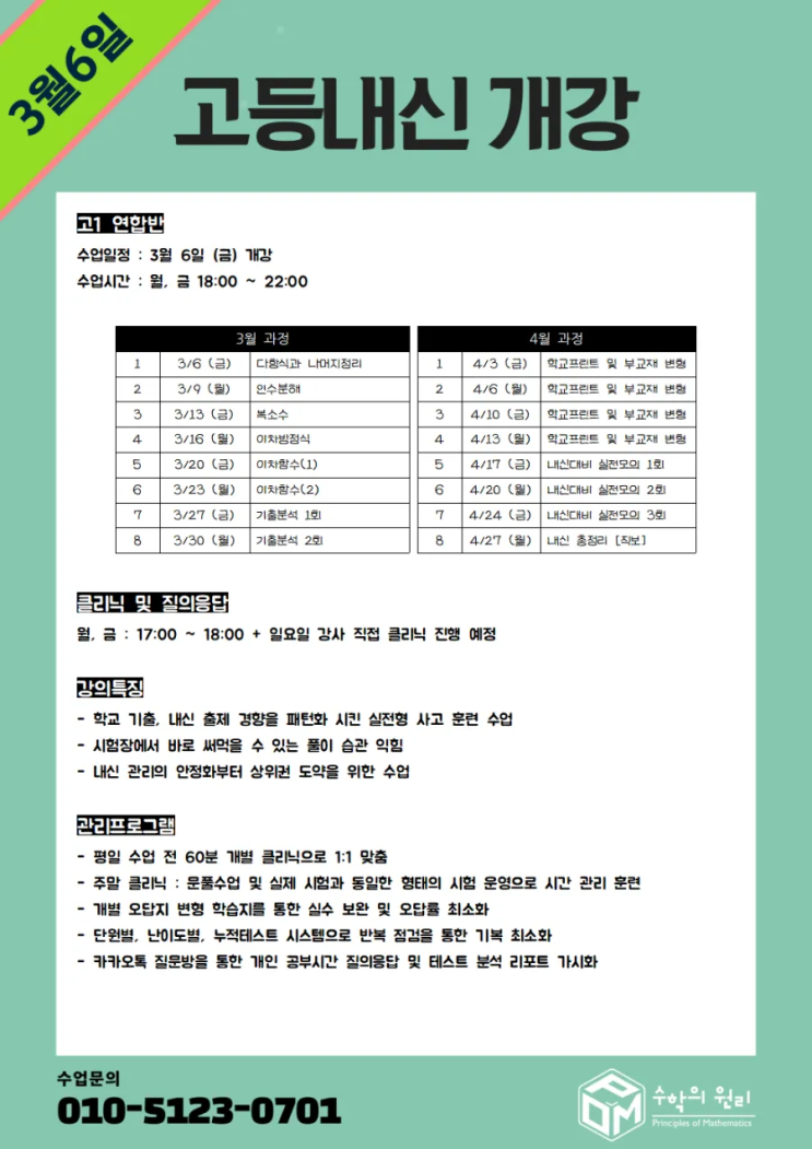 3월6일(금) 수학의원리 고등내신 개강합니다. 소수정예로 수학이 어렵고 부족한 친구들 중,대형 학원에서 시간 낭비마시고 자신에 맞는 학습법과 관리로 내신준비하세요:) <img src="https://blogthumb.pstatic.net/MjAyNjAzMDFfNDUg/MDAxNzcyMzcwNjQxMDk2.-d0xu7h0N5UwapThFRK-RajDqGgS4VKj1UfebqaL-eIg._f4038QtUTuKnTfuK5ABLX7kiJHZlNlalo8aRIRKSnAg.PNG/900%A3%DF1772370304623.png?type=s3" />