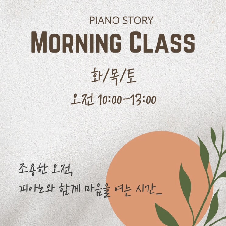 어른을 위한 오전 피아노 클래스 조용한 오전, 피아노 앞에 앉아 나만의 시간을 시작합니다 매주 화/목/토 오전 10시부터 오후 1시까지 진행되며, 주1회 또는 주2회 선택 가능합니다 연습실 이용은 레슨이 없는 날에도 편하게 이용하실수 있어요 :) 새해를 맞아 새로운 취미를 도전하시는 많은 분들이 저희 피아노 스토리를 찾아주시고 계시네요:) 항상 저희 피아노 스토리를 믿고 등록해주셔서 감사드려요 그 사랑에 친절과 꼼꼼한 레슨으로 보답해드릴게요 일상에 작은 쉼표를 더하고 싶을 때, 음악이 가장 좋은 방법이 되어주도록 함께하겠습니다 ❝ ?....... <img src="https://blogthumb.pstatic.net/MjAyNjAxMTBfMjQz/MDAxNzY4MDQ3Njg0MDg3.265oO0KNUiahN-mxJ-dUFFQNWxwKRLYjyhRSvmqpsyAg.yzPTESVvbwoBJkaufFhdM3VNVteJvSnE_caFAZBrfLQg.JPEG/output_3465730901.jpg?type=s3" />