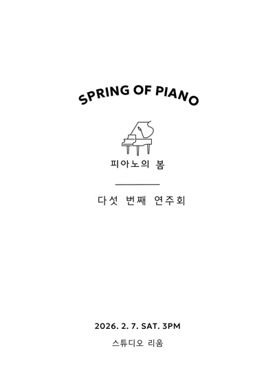 2026.2.7(토) 3시 스튜디오 리움 작년 추석이 지나고부터 준비한 연주회. 여유있게 준비하고자 일찍 시작했는데 결국 마음이 바빠지는 일이 생겼어요. 매서운 겨울을 보내면서 독감이 유행 아이들 차례대로 독감이 지나가면서 수업손실이 있던터라 미리 준비하지 않았다면 아슬아슬한 연주가 되지 않았을까 싶기도 합니다 피아노의 봄 연주회는 모든 수강생이 대상이므로 아이들, 성인 함께 연주합니다!! 아이들은 독주, 듀오 등으로 구성해 모두 두 곡 씩 연주하고요, 성인분들은 선택적으로 두 곡 연주 합니다. 막바지가 다 되어서는 아이들끼리 모여 리허설도 하고, 떡볶이도 먹고 함께 하는 시간도 가졌답니다! 특별....... <img src="https://blogthumb.pstatic.net/MjAyNjAyMDlfMjkx/MDAxNzcwNjQxOTUyNDE1.gRW3FeaXHzS9PGznqdAY0F4vn0Yby_7veWx9AcWGRwkg.63RV2xDdmbosacm2ZAOq72B4XHlq3jVY_2ekWCVYJLkg.JPEG/IMG%A3%DF2775.JPG?type=s3" />