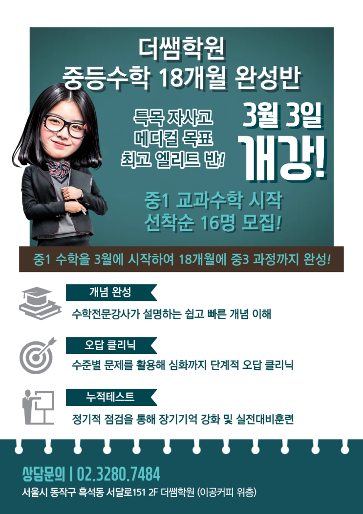 흑석동 수학 과학 전문 더쌤학원에서 중1 교과수학 신규학생 선착순 16명을 모집합니다. 3월부터 시작하여 18개월동안 중1, 중2, 중3 과정을 모두 마치는 최고의 엘리트 코스입니다. 현 초등5, 6학년들은 중등 입학 전 혹은 중1 1학기 자유학기제 기간동안 중등과정을 모두 마치고 중등 심화와 고등수학을 시작할 수 있습니다. 특목, 자사고 진학 또는 의대를 목표로 하는 흑석동 초등 고학년들을 위한 더쌤수학의 엘리트 코스! 아래 신청폼에서 MA11반, MB11반 중 선택하시면 됩니다. https://naver.me/Gi0PZgGX 각 반 8명 모집 후 마감합니다. 초등 전과정으로 입학테스트 실시합니다. 입학테스트는 단순한 점수가 아닌 이해도를 측정하는 실력....... <img src="https://blogthumb.pstatic.net/MjAyNjAyMThfMjc4/MDAxNzcxNDE0NzM3ODEy.YVYjujLTq41l9vj6pSF4oooijvaNUnDoO3Hi0RDsL6Ug.NaeHREL630G456CEDmByFDt_r_ILxmC1a-kWFE8Jn5Yg.PNG/%C1%DF1%BF%A4%B8%AE%C6%AE%B9%DD.png?type=s3" />